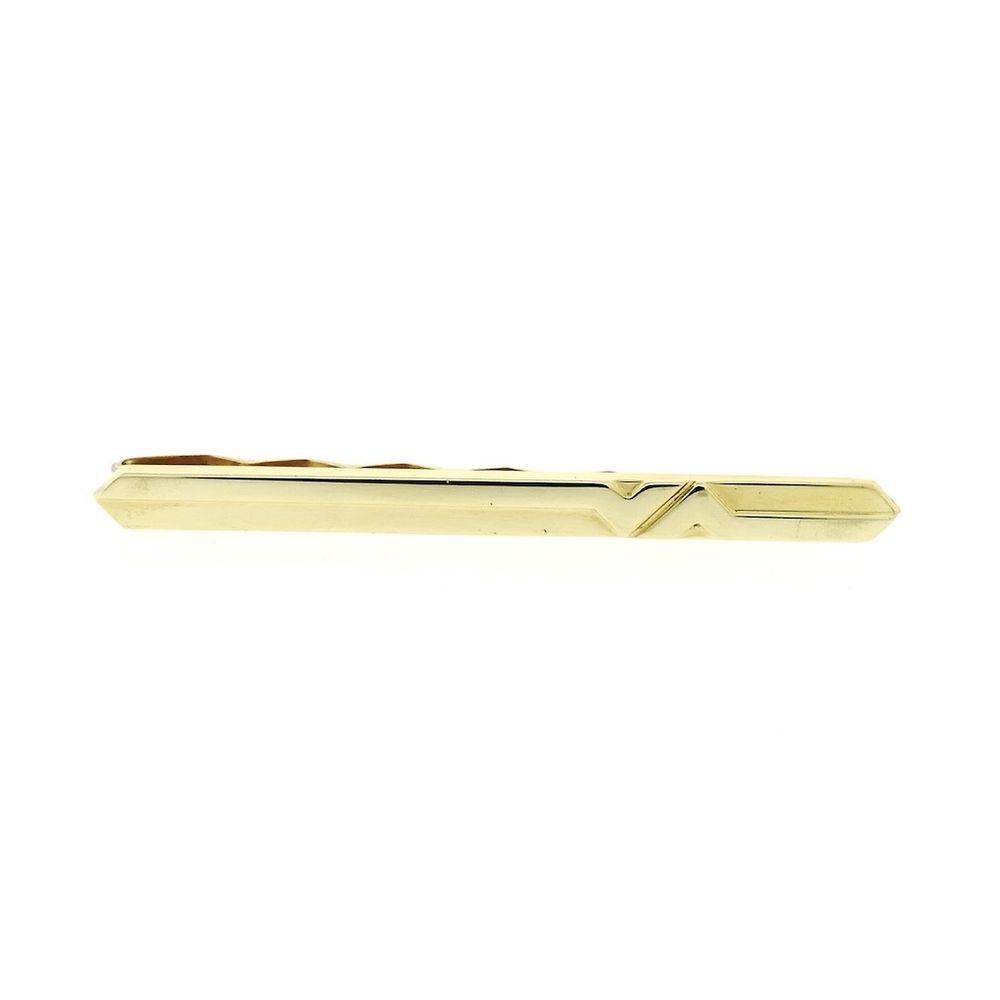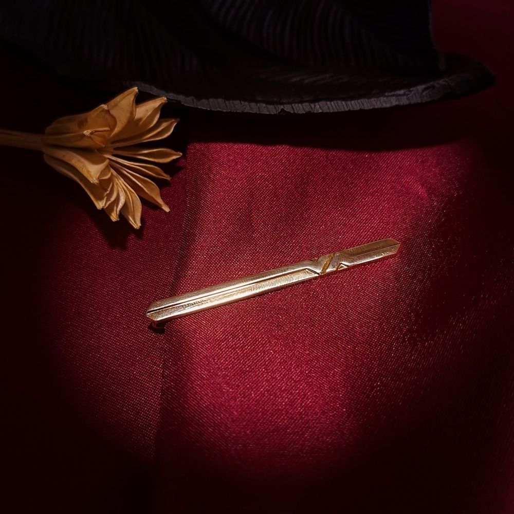 Gold tie clip. A counterpart to the tie pin. This one doesn't need to be pinned to the tie, but can be attached. It's a beautiful antique piece of jewelry that can certainly be worn again today. The tie clip is made of 14-karat yellow gold (585/1000) and a metal slide.