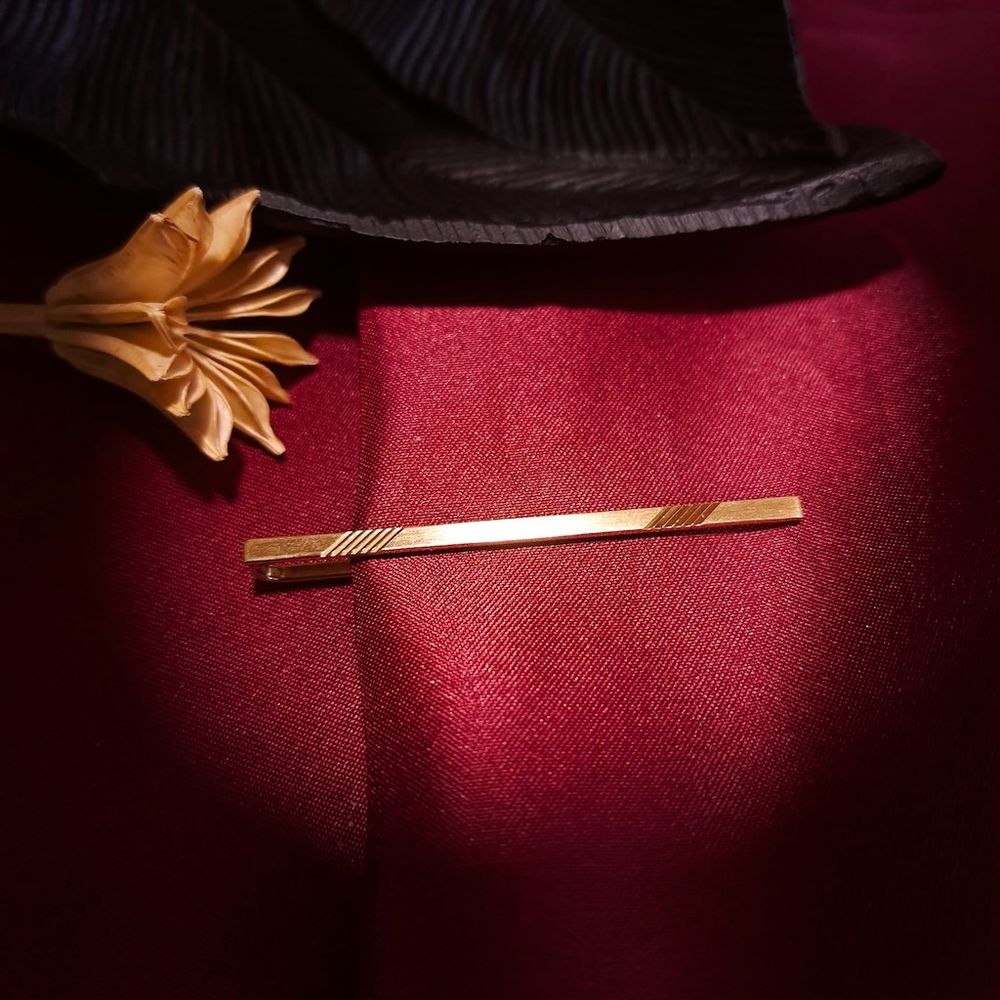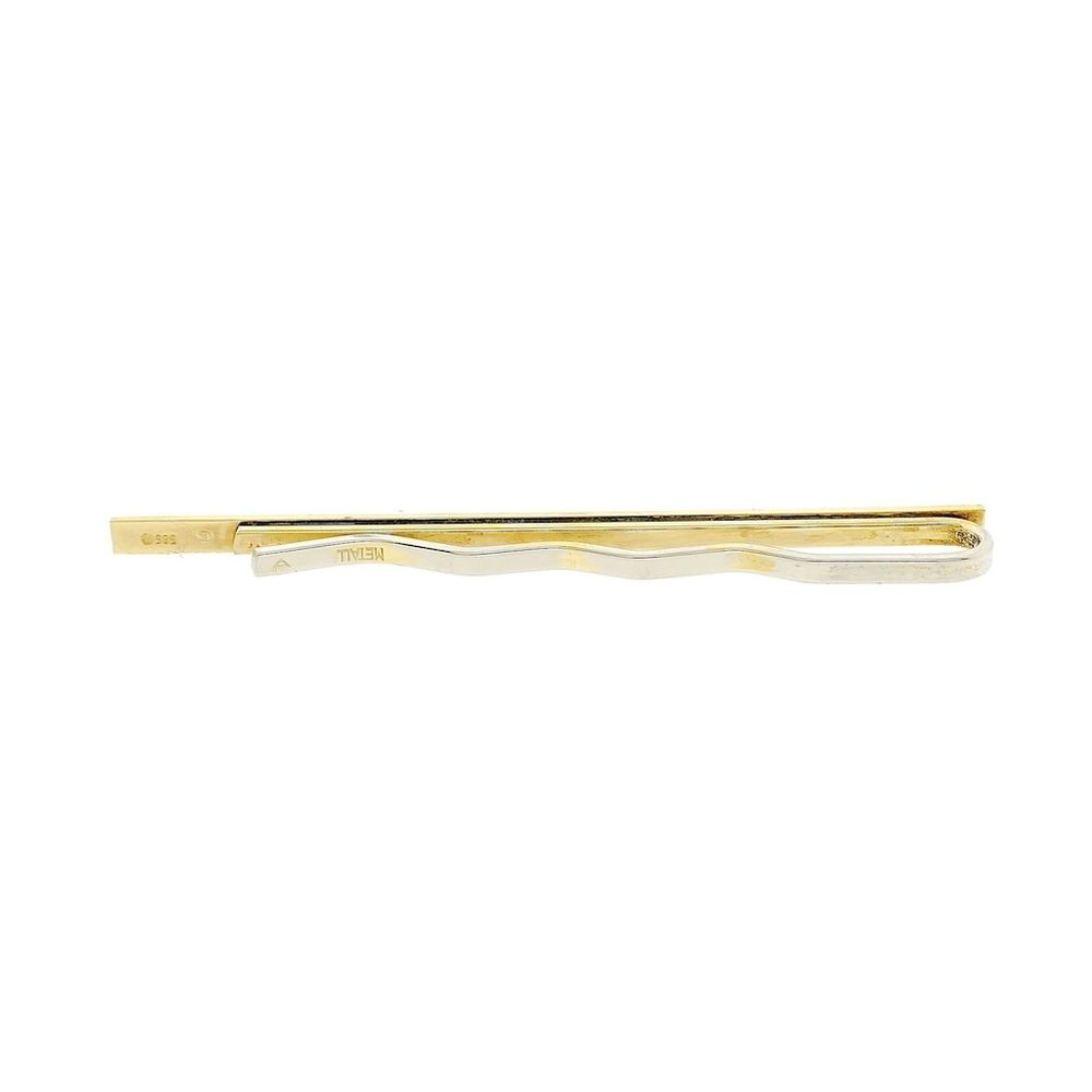 Gold tie clip with diagonal lines. A counterpart to the tie pin. It doesn't need to be pinned to the tie, but can be attached. It's a beautiful antique piece of jewelry that can certainly be worn again today. The tie clip is made of 14-karat yellow gold (585/1000) and a metal slide.