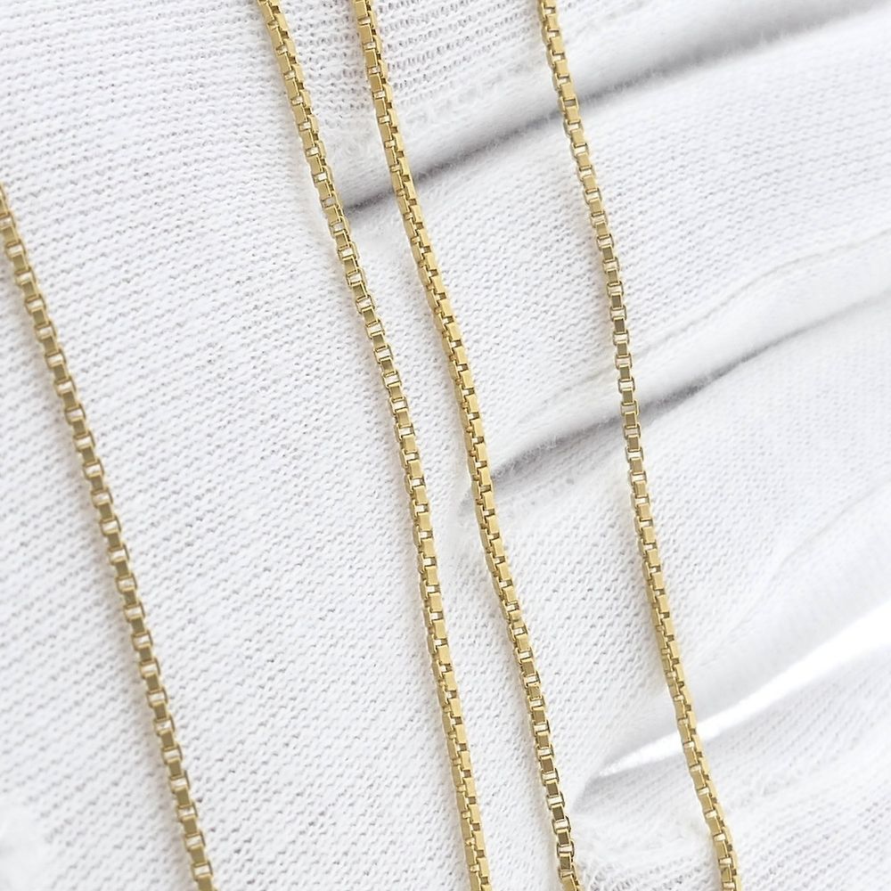 Gold chain with a Venetian link. The Venetian link is a series of blocks, and this chain has a link width of 1.3 mm. This modern and timeless necklace is suitable for a medium-sized pendant and is crafted from 18-karat yellow gold (750/1000).