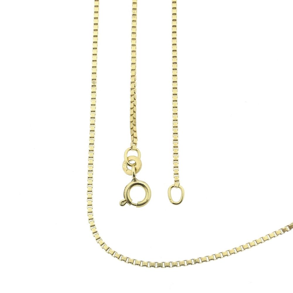 Gold chain with Venetian links. The Venetian link is a series of blocks. The chain has a link width of 1.3 mm and a polished finish. This modern and timeless necklace is suitable for a small pendant and is crafted from 14-karat yellow gold (585/1000).