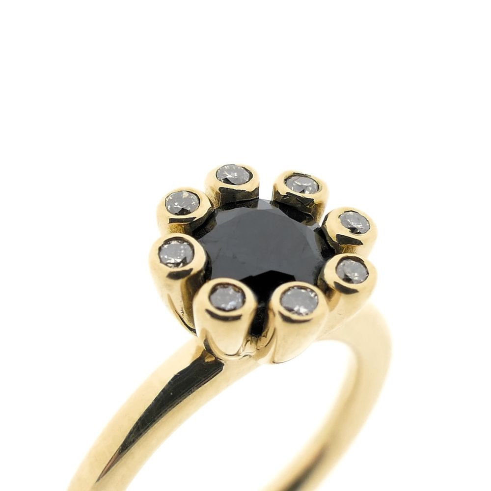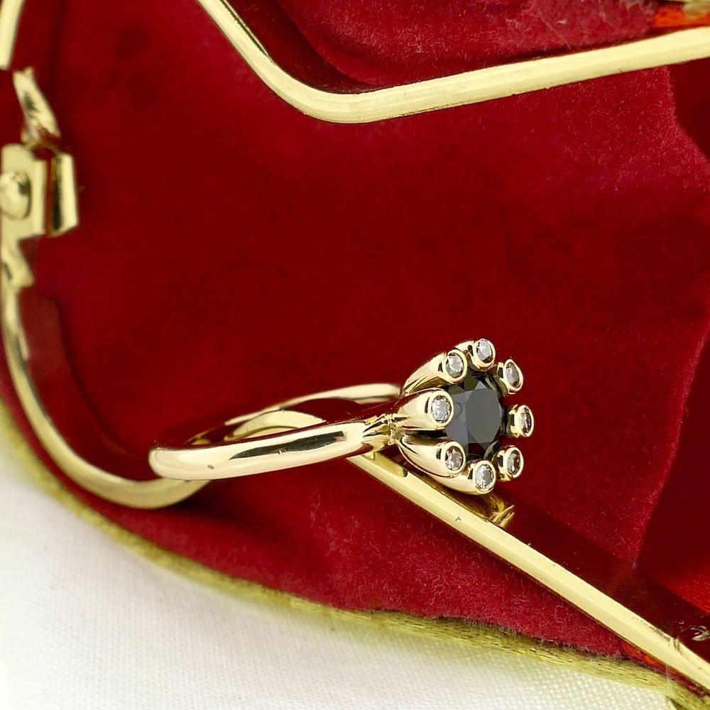 Exclusive gold ring from the BRON brand, from the "Sprite" family. This collection is inspired by the classic entourage design. An exclusive and luxurious ring suitable for any occasion. The round brilliant-cut sapphire has a diameter of 5.5 mm and is surrounded by eight round brilliant-cut diamonds. This gives the ring a floral look. The ring is crafted from 14-karat yellow gold (585/1000).