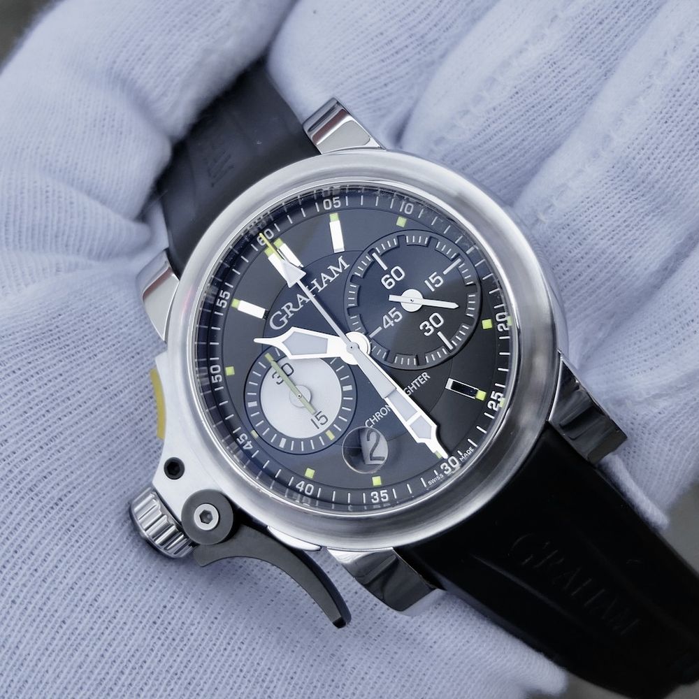 What a stunner and what a standout! This rare (beautiful) Graham Chronofighter Trigger. With a sturdy 46mm case that's certainly striking and worth seeing, and what a beautifully functional trigger system. Operating a chronograph has never felt so comfortable. Because the crown and trigger system are on the left, the lugs are short, and the strap is very supple and comfortable, this watch is exceptionally comfortable to wear, even on smaller wrists. This is a very high-quality Swiss-made precision instrument and boasts numerous patents and distinctive details. The hefty retail price of over €8,000 reveals that this is something special, reflected in the high-quality build and in-house movement. So why buy a mainstream Breitling when you can get something truly special for the same price? Sure, value retention is a concern, but this watch has already made a start, and it's in top condition! Then there's the high-quality Graham in-house 'column-wheel' automatic movement, Cal. G1742 with no fewer than 28 jewels. A timepiece with numerous complications such as a chronograph, date, and 30-second counter. The movement runs like new with an amplitude of 300 degrees and meets Swiss COSC (accuracy) standards. This watch comes as a beautiful full set: a luxury Graham box set, Graham warranty booklet/manual with a 1-year warranty.