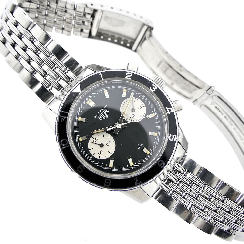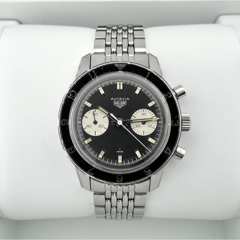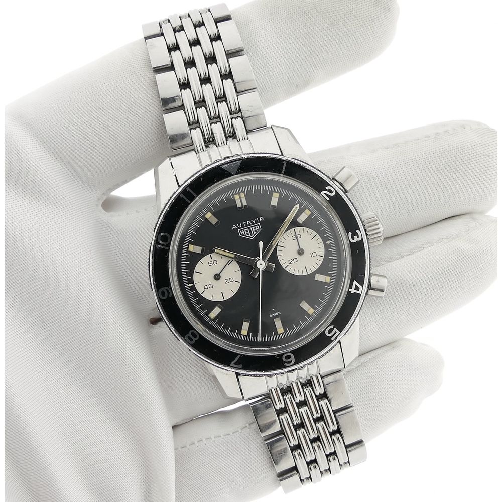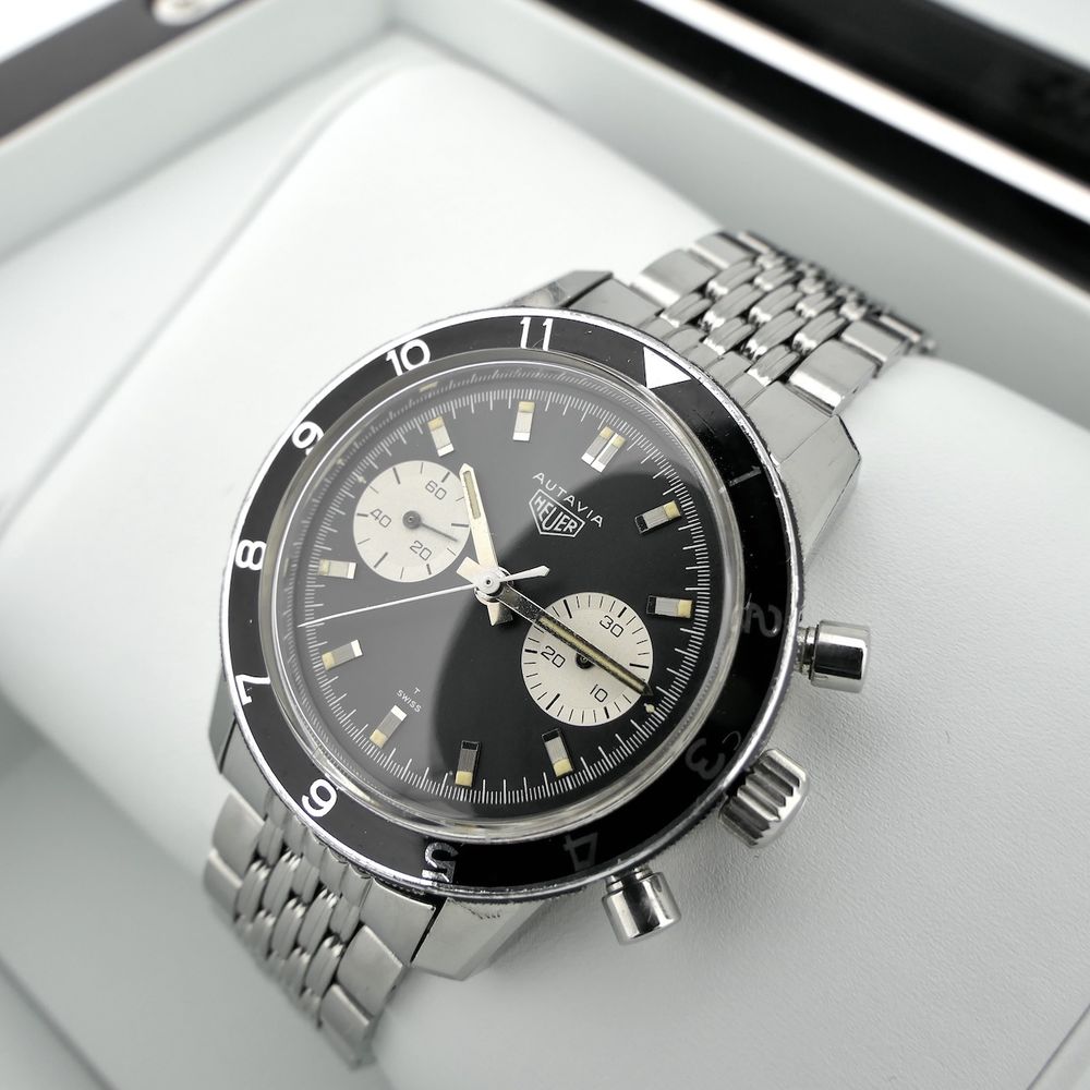 Top vintage in exceptionally good condition! This Heuer Autavia 7763 men's chronograph. Autavia stands for "Auto & Aviation." A top collector's item for vintage enthusiasts. This vintage chronograph, dating from the first quarter of 1968, was primarily used for auto racing and aviation purposes at the time. It was, and still is, a precise timekeeping instrument, hence the name Autavia. A rare vintage watch in beautiful condition on the highly sought-after (and expensive) Heuer "Beads of Rice" steel bracelet. Heuer is the well-known predecessor of the modern Tag Heuer. It became famous for legendary models from the 1960s and 1970s like the Carrera and Autavia (auto & aviation). Heuer is now much more highly regarded than the more modern TAG Heuer, and for good reason. What a history, what a wealth of detail, and what progressive timepieces. This is a fantastic example in beautiful, unpolished, and sharp condition with the original finish, as it was originally delivered. This watch features a beautiful black dial with sporty white details, giving it a so-called "panda dial." This watch is internally equipped with the Heuer-signed Swiss Made Cal. 7730 manual movement, which runs smoothly and accurately, with values that are not out of place in modern timepieces. We measure an amplitude of approximately 277 degrees and a deviation of only a few seconds per day. The original Heuer "Beads of Rice" steel bracelet is also in excellent condition. The bracelet has minimal stretch, is sharp, and with all its links, fits large wrists (over 20cm). These separate bracelets are already sold for around €2000, so that certainly adds significant value to this watch! This watch comes in a luxury in-house box with an in-house warranty report and a 1-year warranty. This is a fantastic opportunity for collectors of rare vintage Heuers and by far the best deal in the world on this original Beads of Rice steel bracelet!