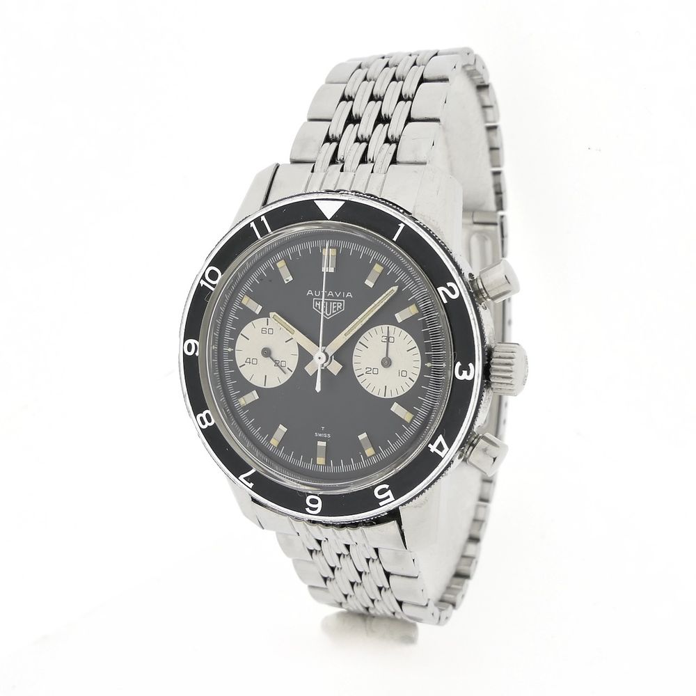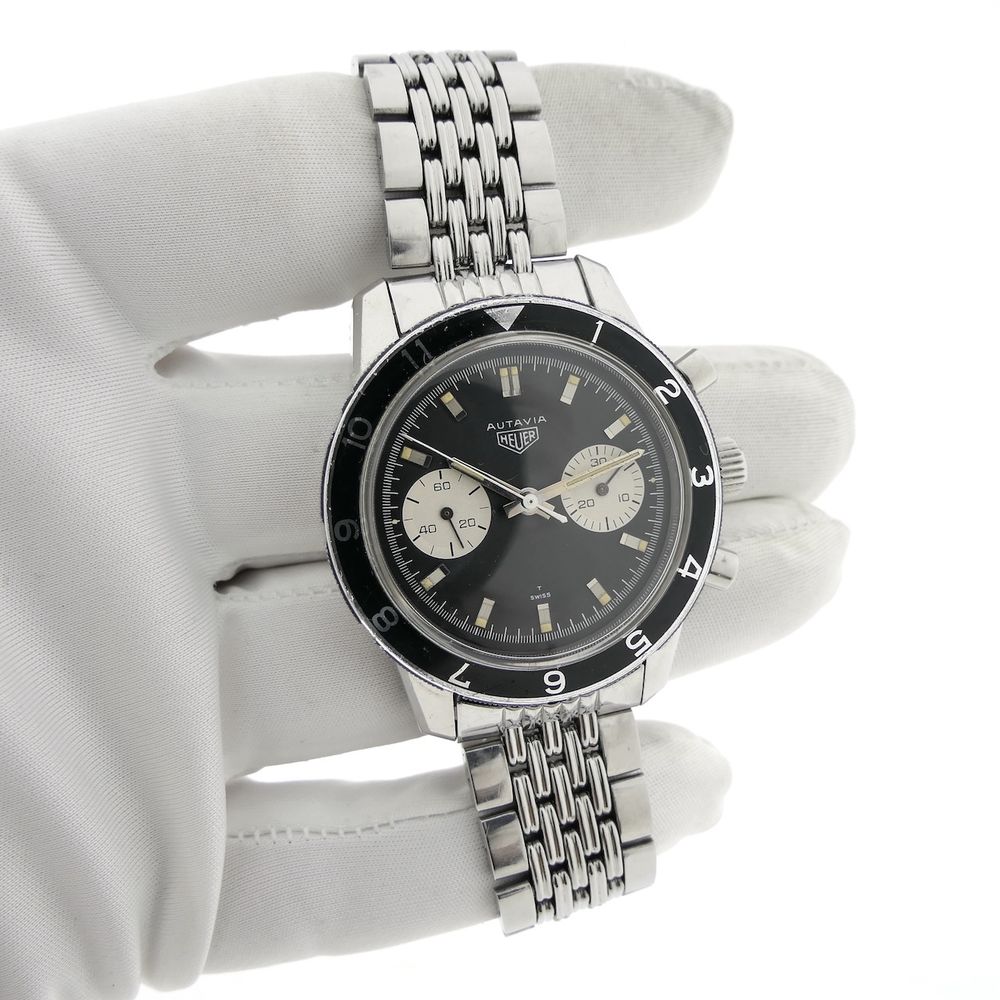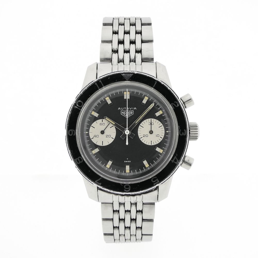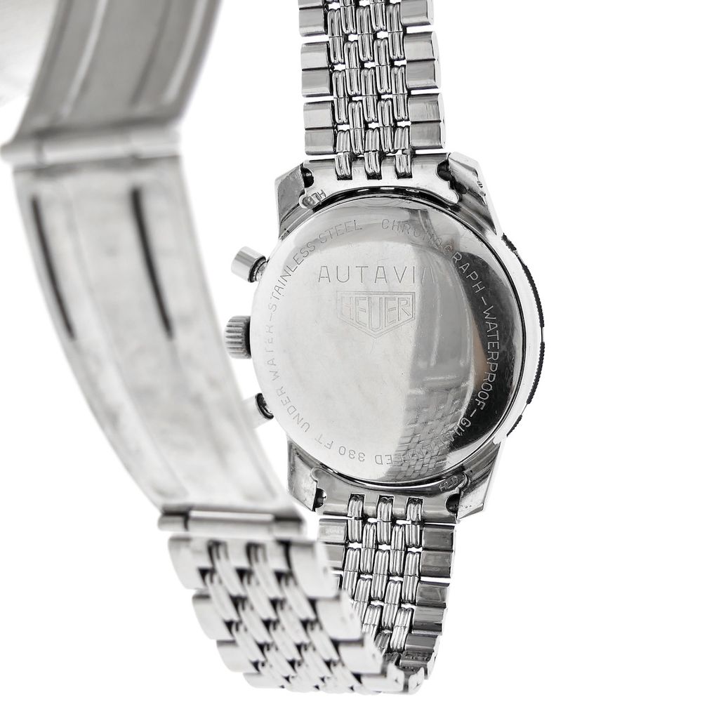 Top vintage in exceptionally good condition! This Heuer Autavia 7763 men's chronograph. Autavia stands for "Auto & Aviation." A top collector's item for vintage enthusiasts. This vintage chronograph, dating from the first quarter of 1968, was primarily used for auto racing and aviation purposes at the time. It was, and still is, a precise timekeeping instrument, hence the name Autavia. A rare vintage watch in beautiful condition on the highly sought-after (and expensive) Heuer "Beads of Rice" steel bracelet. Heuer is the well-known predecessor of the modern Tag Heuer. It became famous for legendary models from the 1960s and 1970s like the Carrera and Autavia (auto & aviation). Heuer is now much more highly regarded than the more modern TAG Heuer, and for good reason. What a history, what a wealth of detail, and what progressive timepieces. This is a fantastic example in beautiful, unpolished, and sharp condition with the original finish, as it was originally delivered. This watch features a beautiful black dial with sporty white details, giving it a so-called "panda dial." This watch is internally equipped with the Heuer-signed Swiss Made Cal. 7730 manual movement, which runs smoothly and accurately, with values that are not out of place in modern timepieces. We measure an amplitude of approximately 277 degrees and a deviation of only a few seconds per day. The original Heuer "Beads of Rice" steel bracelet is also in excellent condition. The bracelet has minimal stretch, is sharp, and with all its links, fits large wrists (over 20cm). These separate bracelets are already sold for around €2000, so that certainly adds significant value to this watch! This watch comes in a luxury in-house box with an in-house warranty report and a 1-year warranty. This is a fantastic opportunity for collectors of rare vintage Heuers and by far the best deal in the world on this original Beads of Rice steel bracelet!
