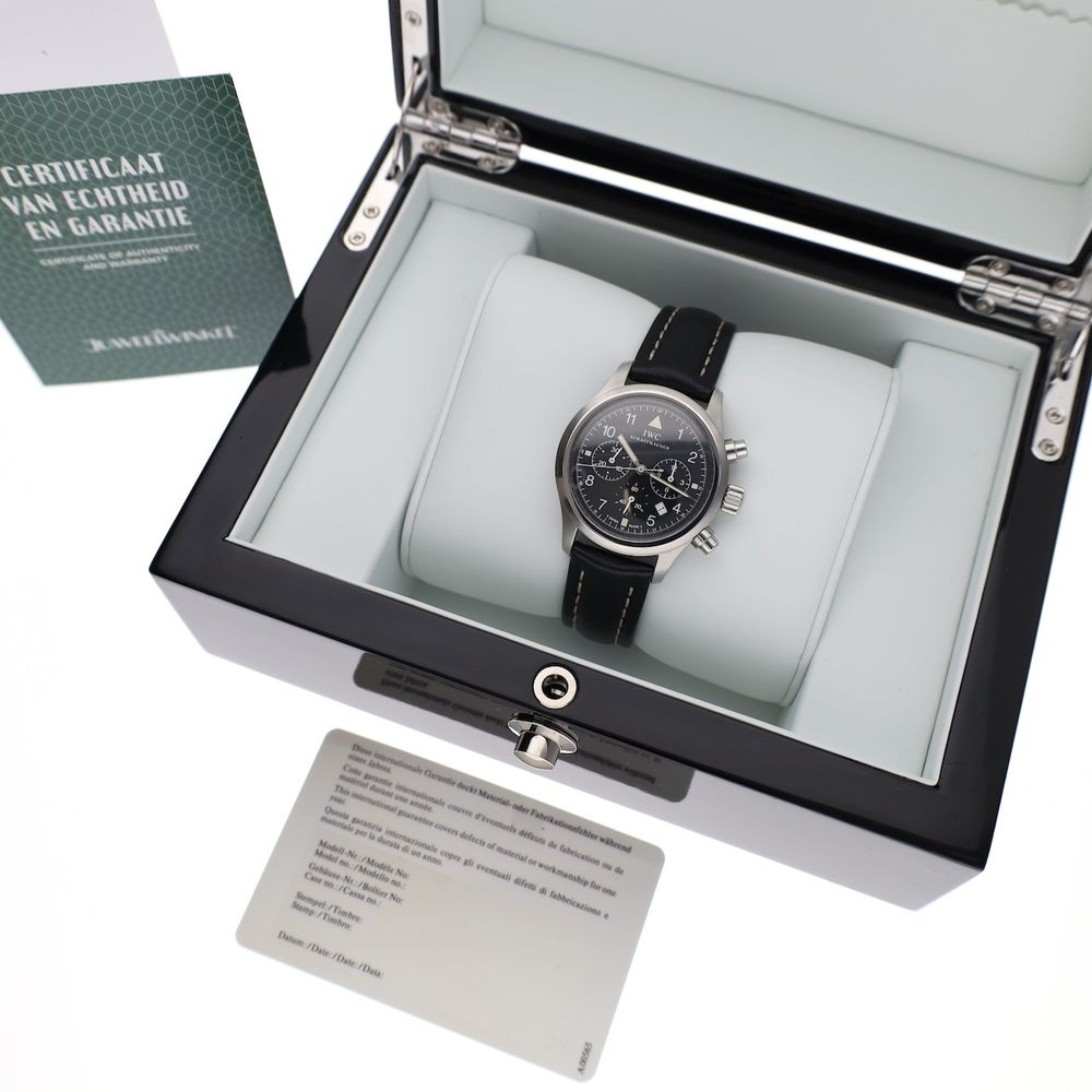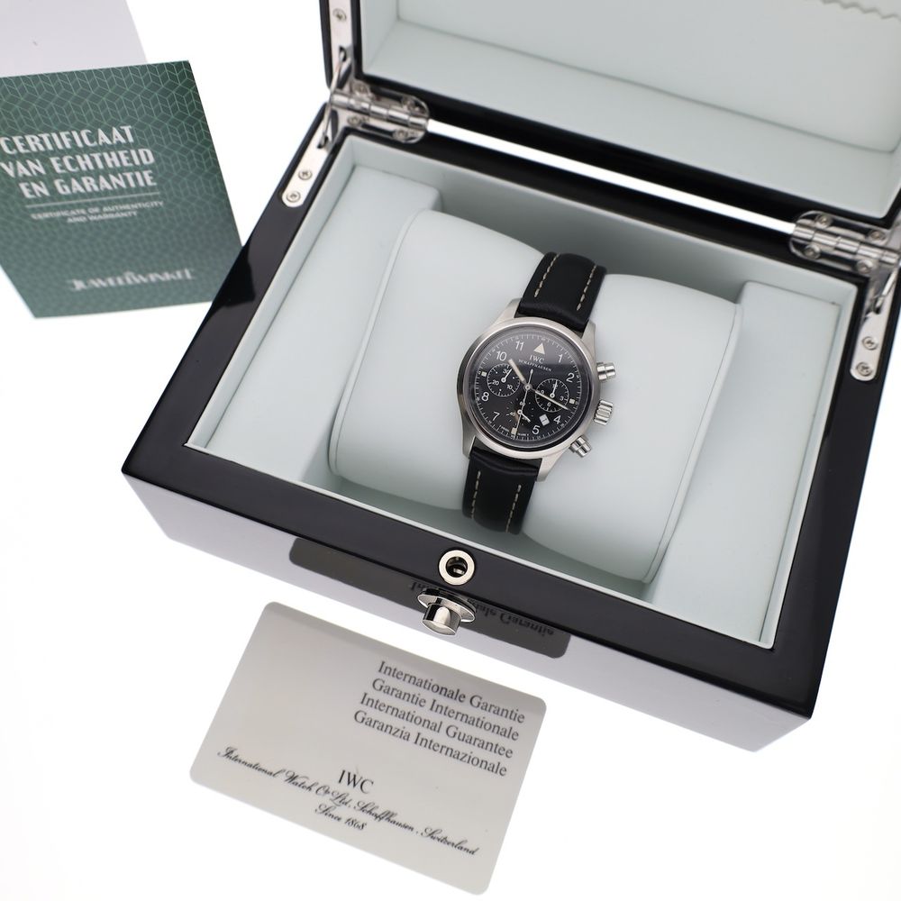 Beautiful vintage IWC Pilot's Chronograph with reference number IW3714. An IWC classic with beautiful details and a high-quality finish. At 37mm, it's very comfortable to wear and a watch suitable for almost any occasion. This watch is in good condition and comes with a blank IWC warranty card. IWC Pilot watches are inspired by early WWII aviator watches. They are very high-quality and recognizable tool watches with a rich history. The Pilot series is one of the longest-running IWC models. This model features an understated matte black dial, beautifully finished and typically IWC, and truly the right choice for a classic aviator like this. The signature IWC crown is beautifully signed. The sapphire crystal has a double anti-reflective coating, as only IWC can achieve, making the dial so sharp and detailed that, despite its understated character, it is a true eye-catcher. The case houses a complicated Mecaquartz movement, IWC Cal. 630 (based on a Jaeger-LeCoultre) with no fewer than 233 parts. This timepiece has a quartz base with a mechanical chronograph mechanism. The movement (seconds hand) ticks like a quartz movement, and the chronograph hands move like an automatic movement. The main advantage: it always keeps time and is as accurate as a quartz movement, yet it also has the mechanical charm and complexity. The movement, like the watch itself, is in excellent condition and has a new battery. All functions work flawlessly, and the watch runs extremely accurately. The leather strap is new, beautiful, high-quality, and wears wonderfully. This high-quality Moratello strap features the IWC-signed buckle. The strap fits wrists up to approximately 20 cm. We have many straps that fit perfectly, so if you prefer a different strap, that's easily arranged. This watch comes with a luxury in-house box, a blank IWC warranty card with our in-house warranty report, and a 1-year warranty.