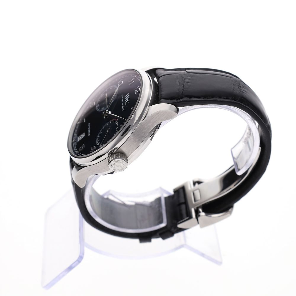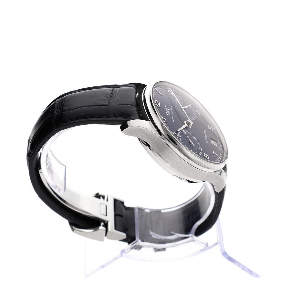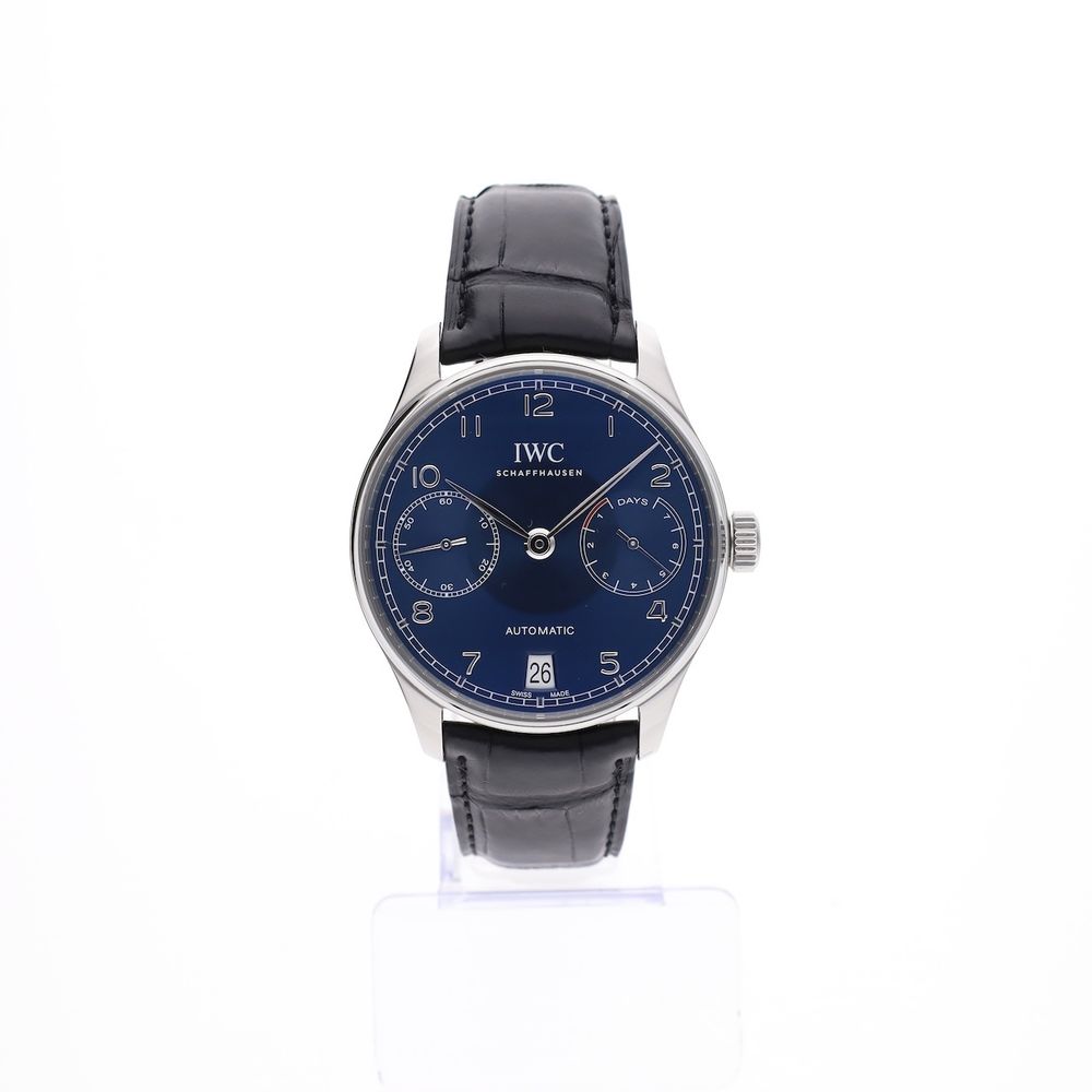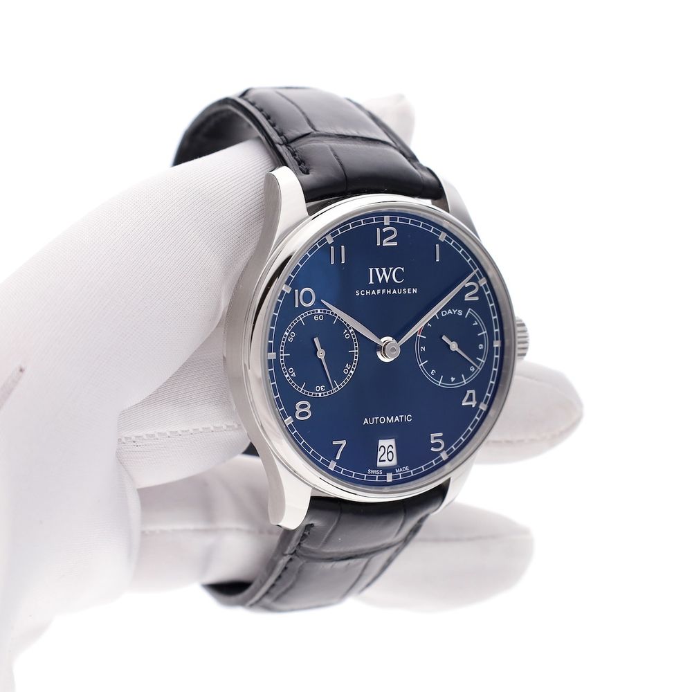 RESERVED UNTIL 06-02-2026; The IWC Portugieser Automatic IW500710, better known as the '7-Days', is a masterpiece of craftsmanship and elegance, part of IWC's prestigious Portugieser collection. Combining classic aesthetics with cutting-edge technology, this timepiece pays tribute to the brand's rich history and its Portuguese roots. With its timeless design and impressive technical specifications, the IW500710 is a favorite among watch enthusiasts and collectors. This IWC Portuguese '7 Days' is a real eye-catcher on the wrist and measures a pleasant 42.3mm in diameter. This IWC Portuguese '7-Days' is crafted in steel and features a stunning blue sunburst dial. This watch is in mint condition and comes as an overcomplete full-set from 2019 with an extra strap and a full IWC revision in 2024. The case of this timepiece is completely filled with the special automatic movement with no fewer than 326 parts. The IWC Manufacture Cal. 52010, a so-called '7-Days' movement with which this IWC timepiece is equipped, is able to keep the correct time (mechanically!) for approximately 168 hours. The timepiece has of course been extensively tested and measured and achieves top values such as an amplitude of over 287 degrees and a deviation of max. +4 sec./24h. The IWC crocodile leather strap is an XL (extra long) version and is also in mint condition (replaced during the IWC revision in 11-2024). It wears very comfortably and fits wrists from 17 cm to approximately 22 cm. The strap is equipped with the original steel IWC folding clasp. Just the way you want it on a luxury watch like this. It also comes with a spare IWC crocodile leather strap in size L. This watch comes as a beautiful full set, including a luxury IWC Portuguese box, an IWC Warranty Card, an instruction manual, IWC service papers, an extra IWC strap, and our in-house warranty report with an IWC warranty valid until March 5, 2027!