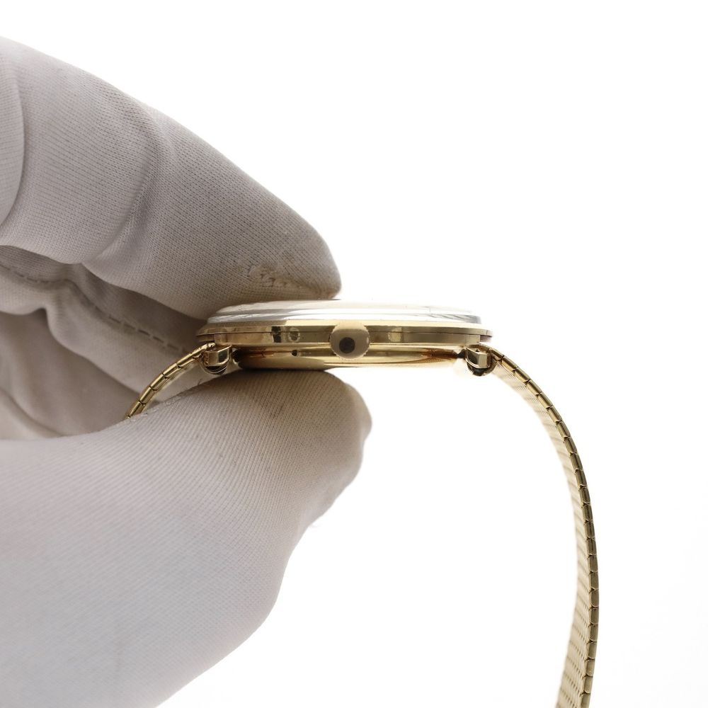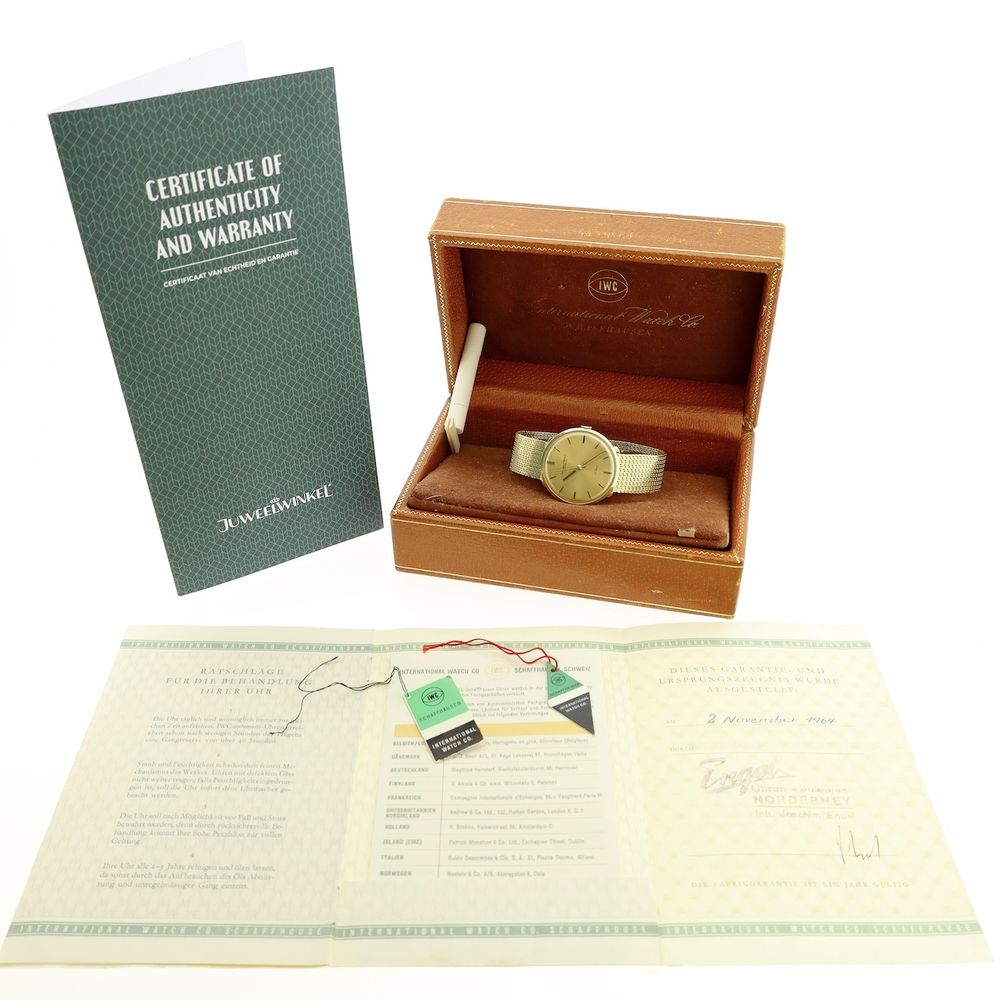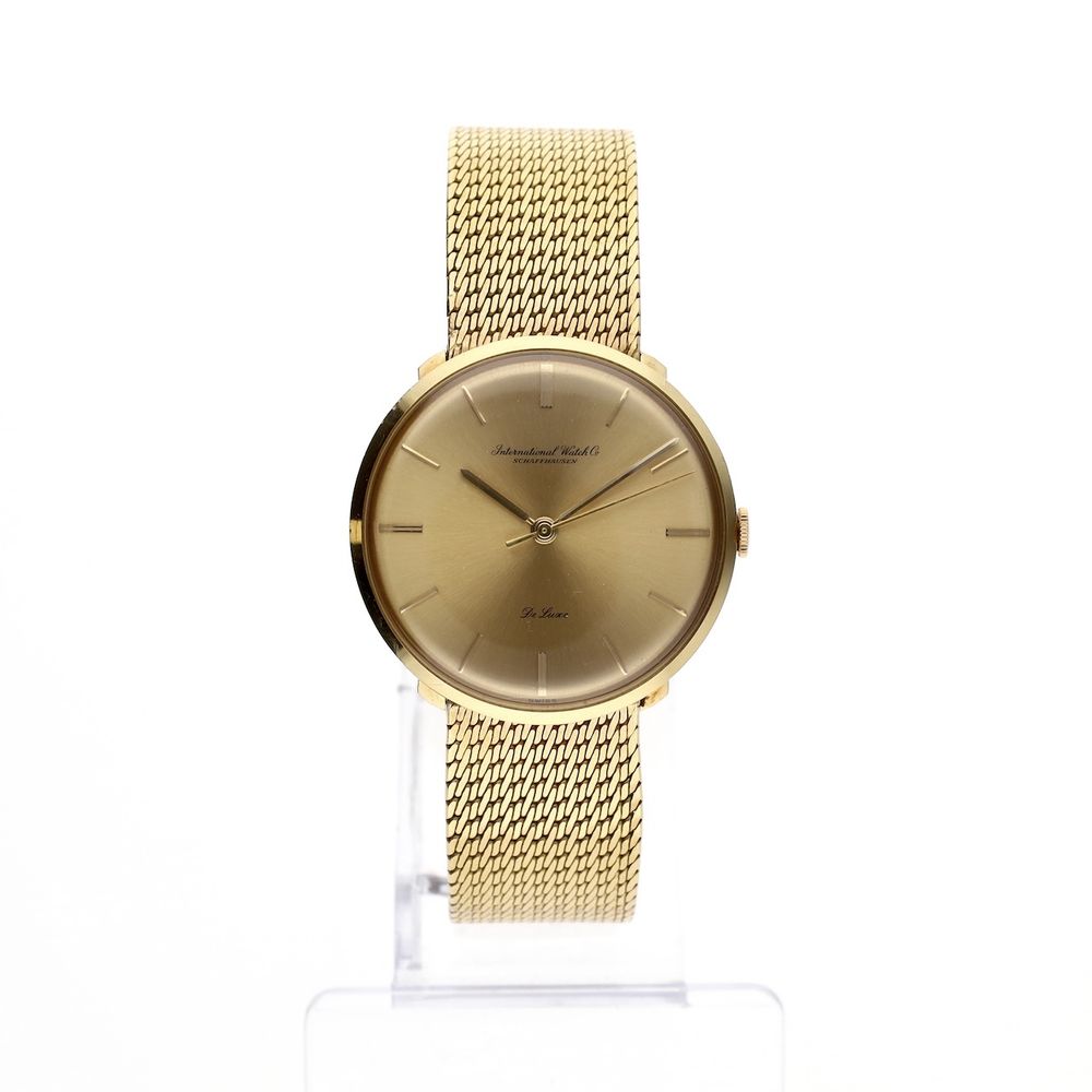 This is awesome! An extremely rare piece of Swiss watchmaking history, this 1964 IWC "De Luxe" is crafted in 18-karat yellow gold. A masterpiece of understated luxury. A true gem for the collector or lover of classic elegance. With its refined, minimalist dial, slim case, and beautiful Milanese bracelet, this watch epitomizes 1960s style. The 18k gold case exudes warmth and class, while the hand-wound IWC caliber guarantees Swiss precision. This isn't a watch that screams for attention; it whispers class. At 35mm, it's a classic men's watch and a true dress watch. What makes this IWC De Luxe truly special is the rare full set it comes in. Includes the original vintage IWC box, accompanying warranty papers dated November 2, 1964, and two original numbered hangtags. A unique find for collectors; complete sets from this period are exceptionally rare. The watch is in excellent vintage condition and has been fully inspected by our watch specialists. Everything about this timepiece exudes originality and craftsmanship. A quality heirloom that will last for generations. The 18k gold Milanese bracelet is a true work of art and unique in its kind thanks to its integrated folding clasp with lock and infinitely adjustable length between approximately 17 and 19.5 cm.