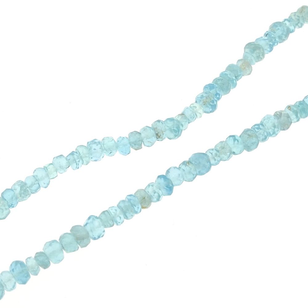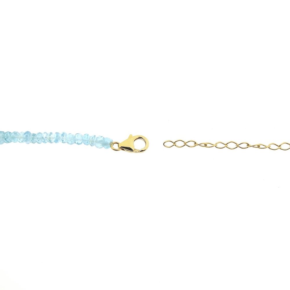Light blue topaz bead necklace with a gold clasp. The beads, approximately 4.5 mm in diameter, are strung on an elastic cord. The necklace closes with a gold lobster clasp and is crafted from 14-karat yellow gold (585/1000).