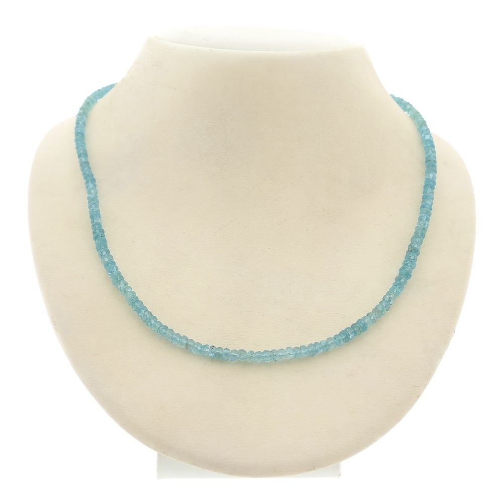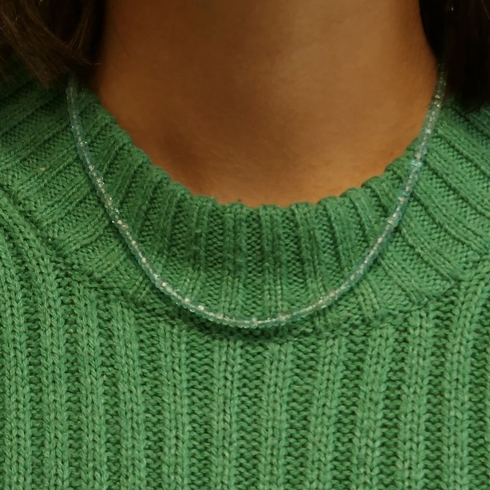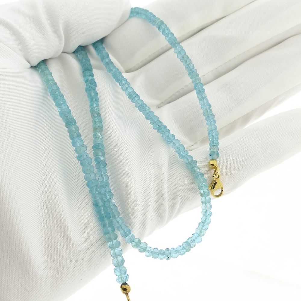 Light blue topaz bead necklace with a gold clasp. The beads, approximately 4.0 mm in diameter, are strung on an elastic cord. The necklace closes with a gold lobster clasp and is crafted from 14-karat yellow gold (585/1000).