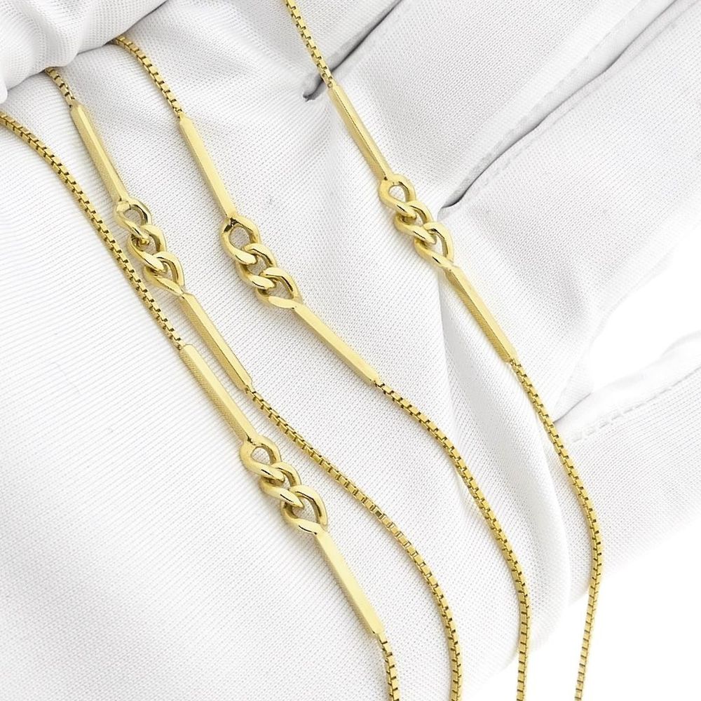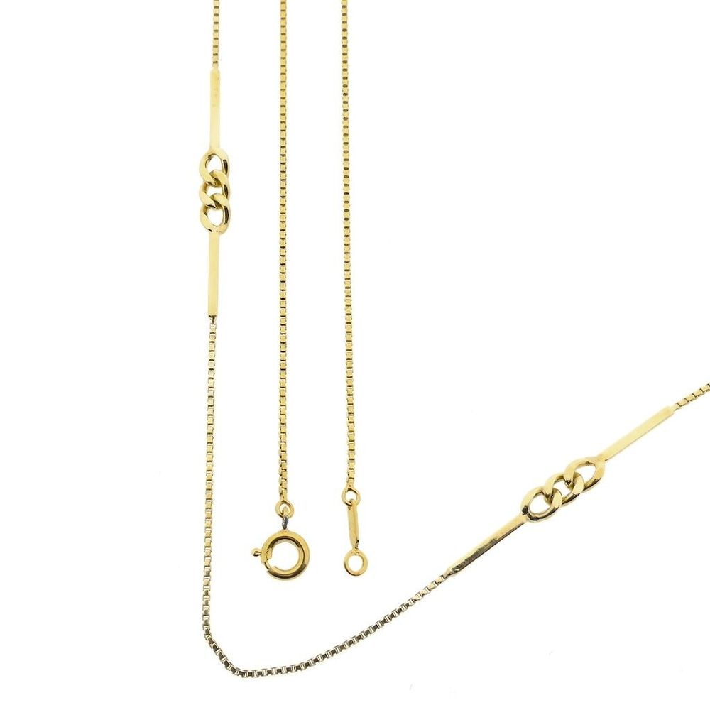 Long gold chain with bars. The necklace features a Venetian link alternating with bars and gourmet links. The chain is very long; in the past, this was called a sautoir. These long necklaces were designed to emphasize the woman's hips through the shimmering movement. The necklace can also be folded in half once or twice. This long women's necklace closes with a spring ring and is crafted from 14-karat yellow gold (585/1000).
