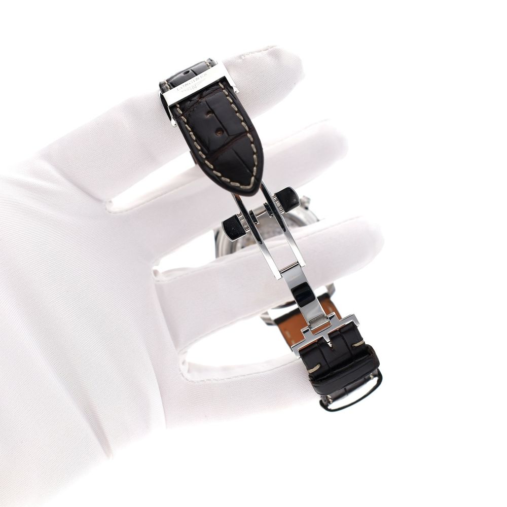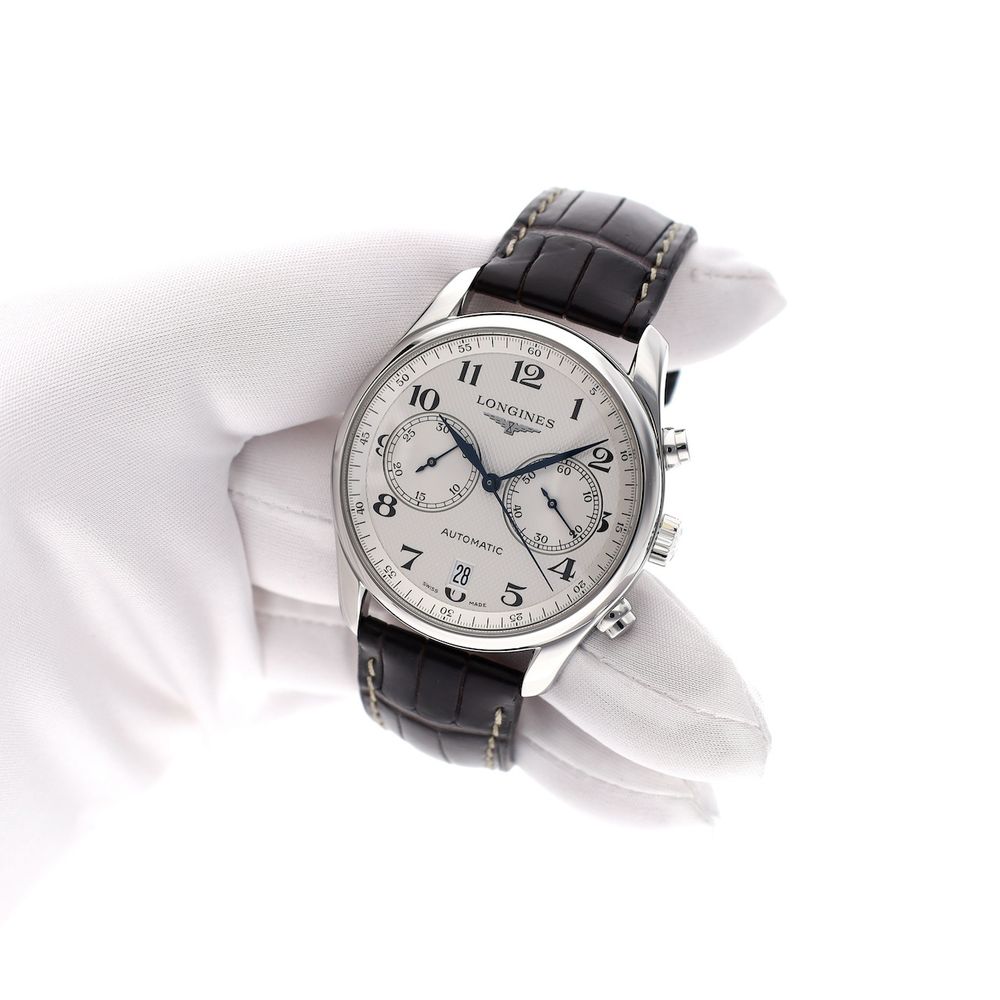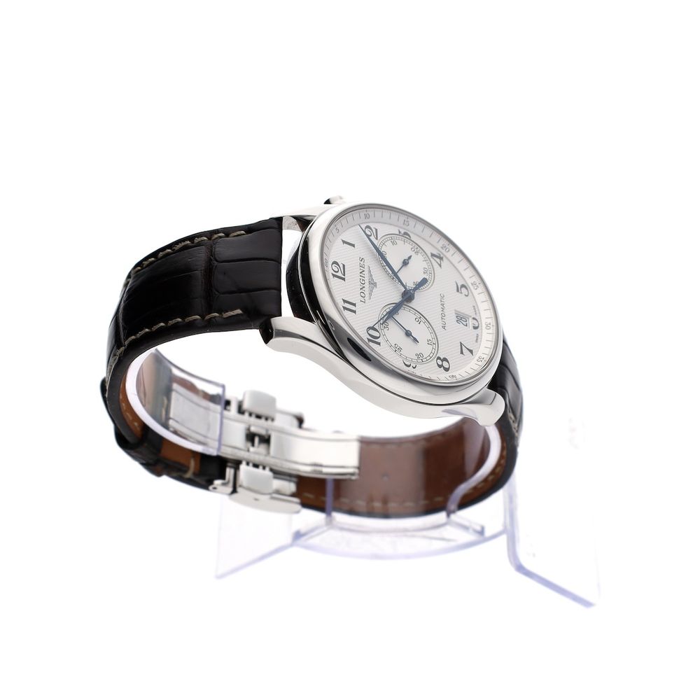 Beautiful Longines Master Collection chronograph. Exquisite details, a guilloché dial, sapphire crystal on both the front and back, an elegant and slim 40mm case, and a high-quality finish, typical Swiss top quality, all at a reasonable price. The current retail price is €3200. Longines, Swiss-made watches since 1832. Since the beginning, they have been creating exceptional timepieces, aviators' watches, and aviation instruments. Today, Longines produces high-quality mechanical and automatic watches equipped with the finest Swiss-made movements with extreme accuracy. This watch is equipped with a Swiss automatic chronograph movement; Longines Cal. L651.3 with no fewer than 37 jewels. This movement runs perfectly and accurately; we measure an amplitude of 290 degrees and a maximum deviation of 1 second per 24 hours. Fortunately, all this beauty is visible through the transparent caseback. The original Longines brown leather crocodile with a Longines folding clasp is also in excellent condition and ready for its new owner. The strap fits wrists up to approximately 20cm. This watch comes with the original box, Longines warranty card, manual, and a 1-year warranty.