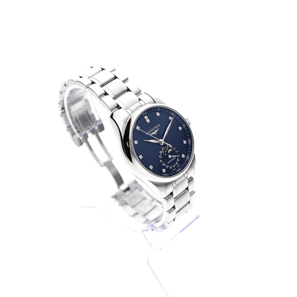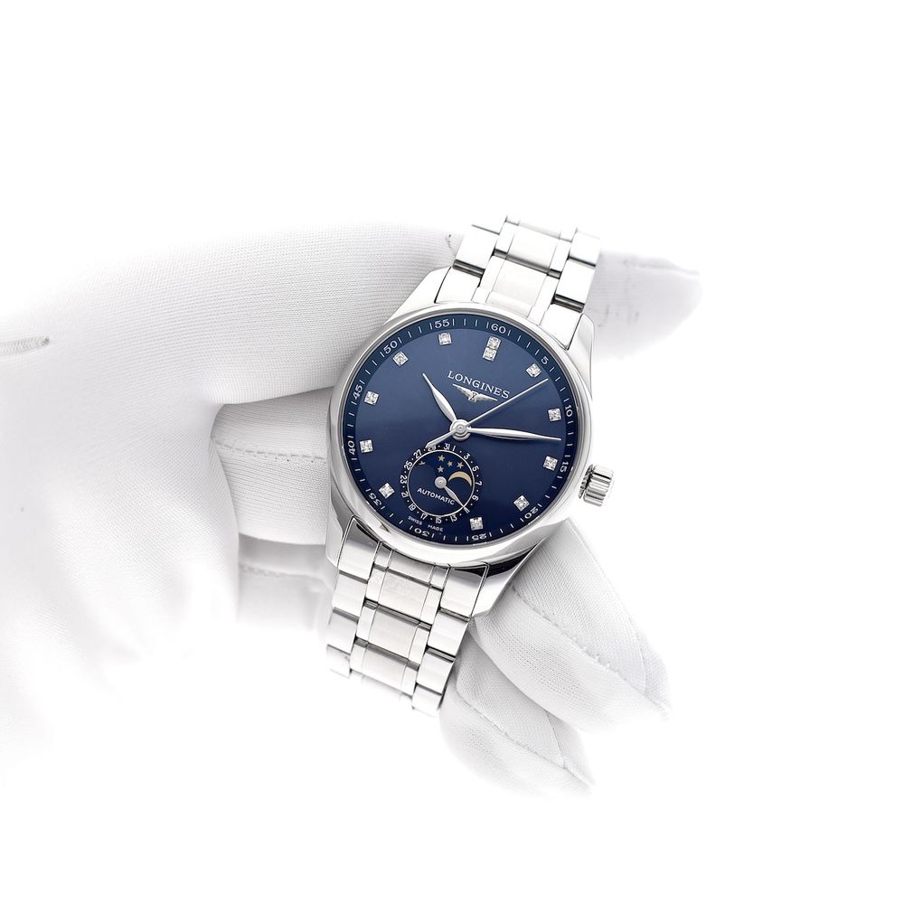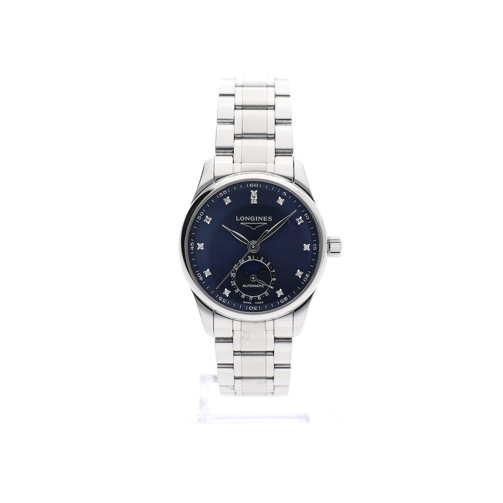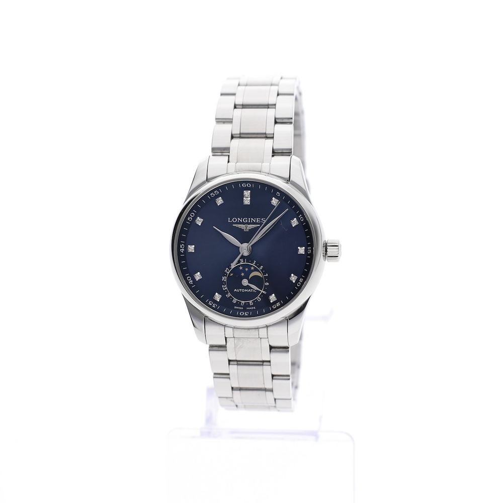 Style and class for women! The Longines Master Moonphase Automatic is a beautiful, chic watch from the Longines Master Collection, known for its classic designs and refined finishes. This particular model stands out for its moonphase complication, high-quality Swiss automatic movement, sapphire crystal on both the front and back, genuine diamond indices (with certificate), and its high-quality finish and timeless elegance. This watch from 2023 is in very good condition and comes as a beautiful full set. This Longines Master Moonphase has a 34mm case, a classic size, suitable for women who prefer a timeless and subtle design and perfect for everyday wear. The case is made of stainless steel with a satin and polished finish. This combination gives the watch a luxurious appearance without being overly obtrusive. The blue dial has a refined sunburst texture, adding a subtle yet striking detail to the overall design. The diamond indices give it a striking appearance and make it a real eye-catcher. The dial features a beautiful moon phase indicator that contrasts beautifully with the background, creating an elegant and legible display. The slim, gold-plated hands for the hours, minutes, and seconds further enhance the watch's refined appearance. The current retail price is €3,350. This watch is equipped with a Swiss automatic chronograph movement; Longines Cal. 100 with no fewer than 25 jewels. This movement runs perfectly and accurately; we measure an amplitude of 295 degrees and a maximum deviation of 3 seconds per 24 hours. Fortunately, all this beauty is visible through the transparent sapphire caseback. This beautiful watch is fitted with a beautifully finished, high-quality steel bracelet that perfectly balances the whole. The bracelet fits wrists up to approximately 18.5 cm and can be custom-made/delivered by us. This watch comes with the original box, Longines warranty card, Longines diamond card, manual, and warranty report with a 1-year warranty. A beautiful piece of jewelry, fully set and in top condition!