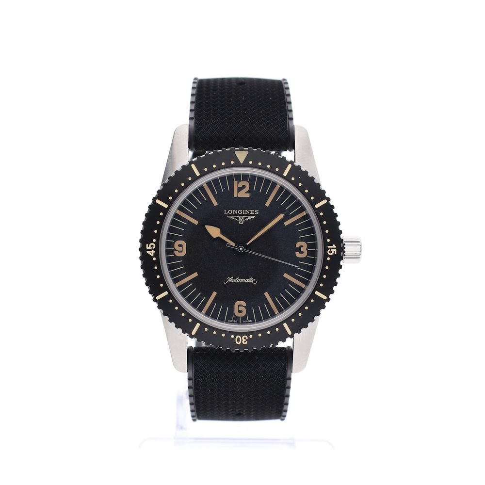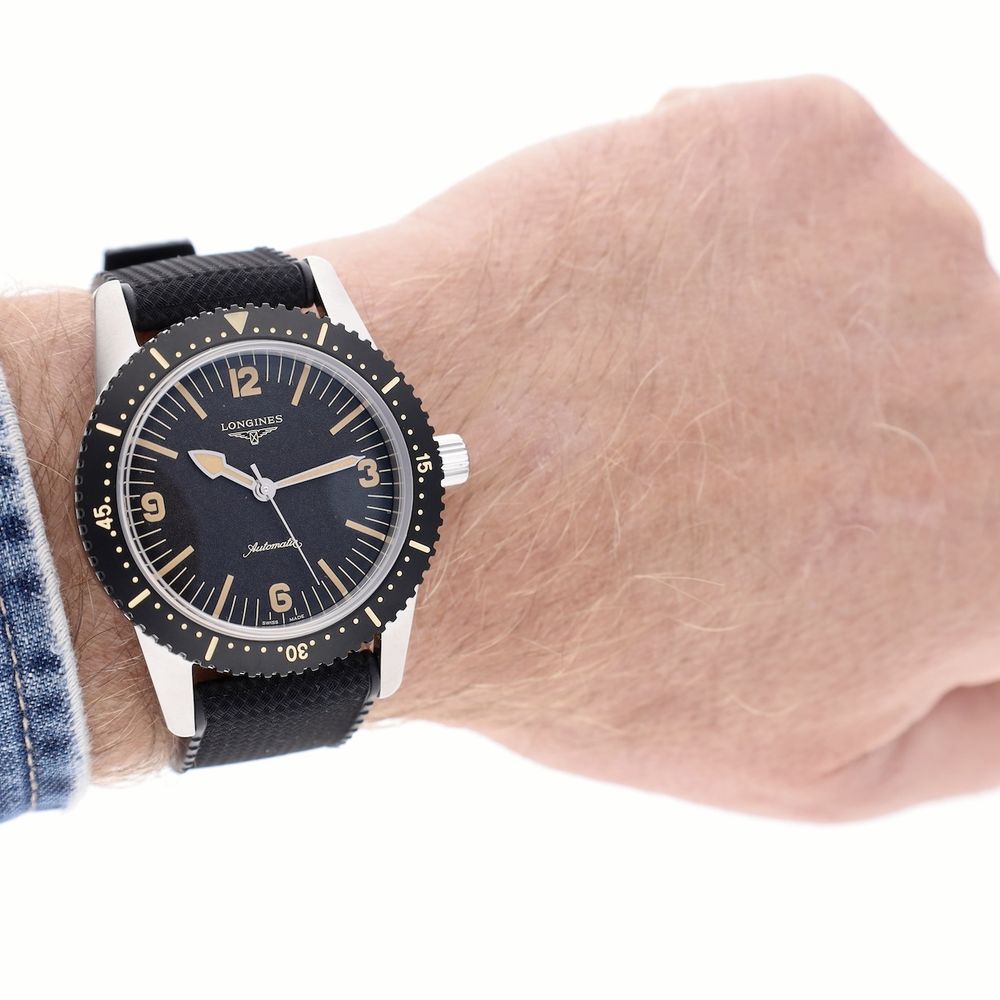 Longines Skin Diver Watch with reference number L2.822.4.56.9, Dive into history with a modern classic. The Longines Skin Diver pays tribute to Longines' first diving watch from 1959. With this model, Longines creates a beautiful interplay of vintage charm and contemporary technology, ideal for lovers of classic sports watches with a modern twist. This watch is new and unworn and comes as a beautiful full set from 05-2025. This is a model with a last known retail price of €2700, and we are offering this watch at a significant discount. This Skin Diver features a robust 42 mm stainless steel case, a unidirectional diving bezel with a black PVD coating, and a deep black/matte dial with striking luminous indices and hands, all without a date. Everything creates a sporty, clean, and balanced look. The watch strap, Longines rubber with a textured pattern, is very comfortable, wear-resistant, and water-resistant. The strap fits wrists up to approximately 21cm. Because this watch also looks excellent on a brown leather strap, we include one (high-quality, Moratello, Italy) free of charge; changing it can be quite a pleasure. Inside ticks the reliable Longines caliber L888, an automatic movement with a power reserve of approximately 64 hours. This modern movement offers not only high precision but also a long power reserve. The movement runs excellently and very accurately, as you would expect from a high-quality Swiss watch. This watch comes with the original Longines box, Longines warranty card, booklet, and our in-house warranty report with a 1-year warranty.