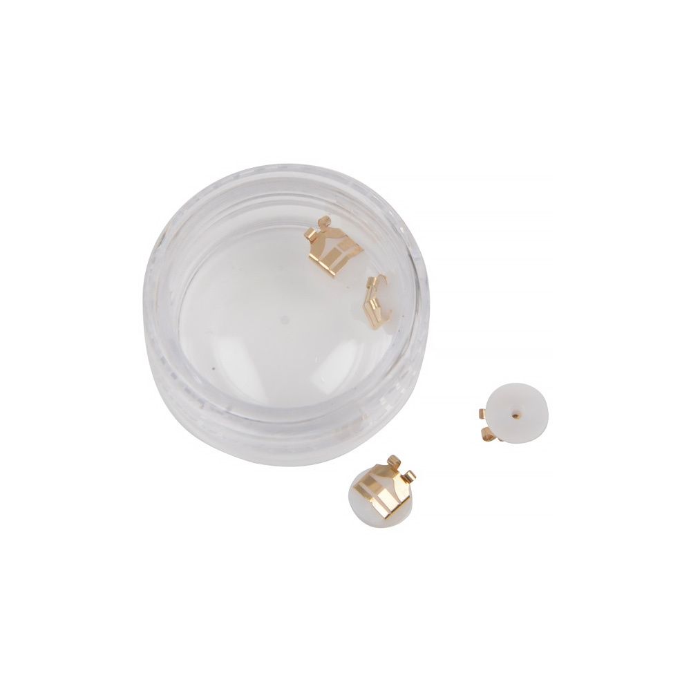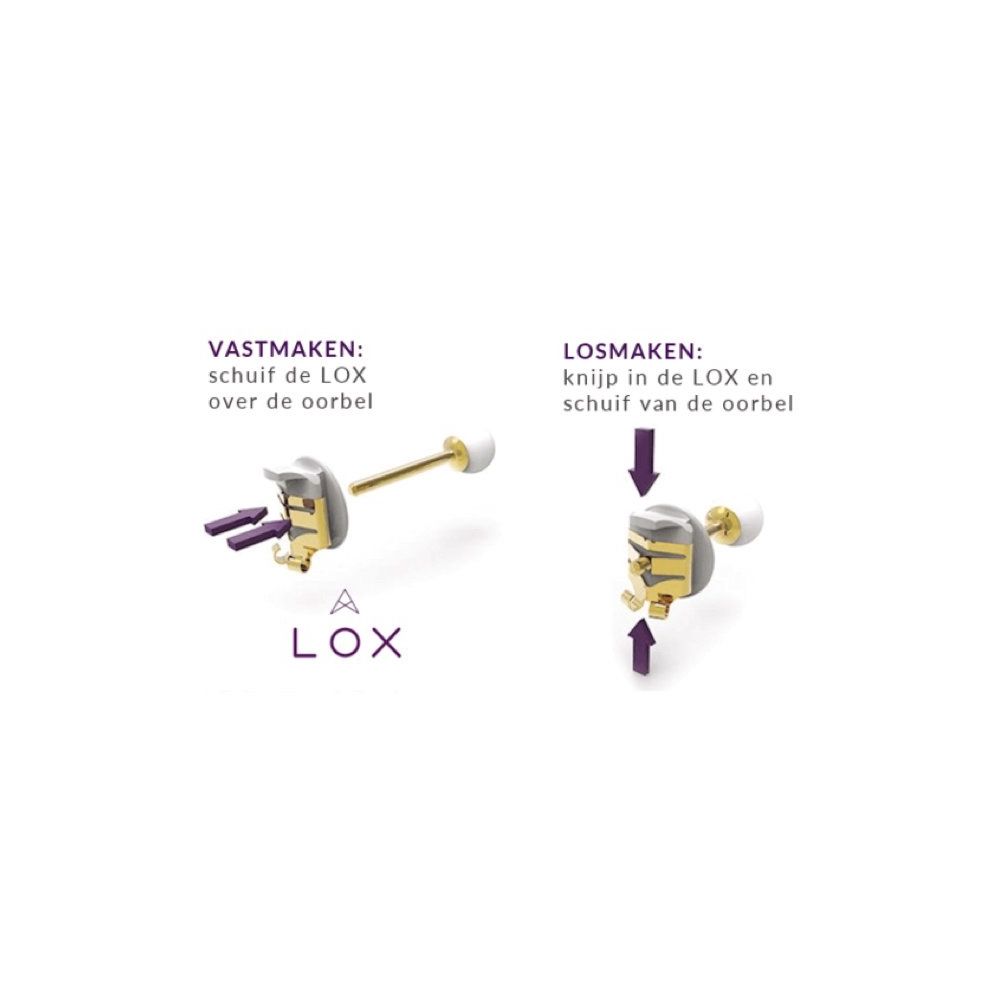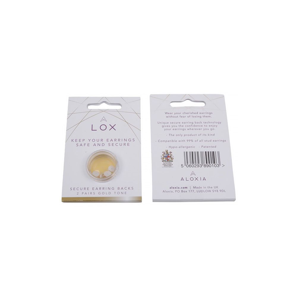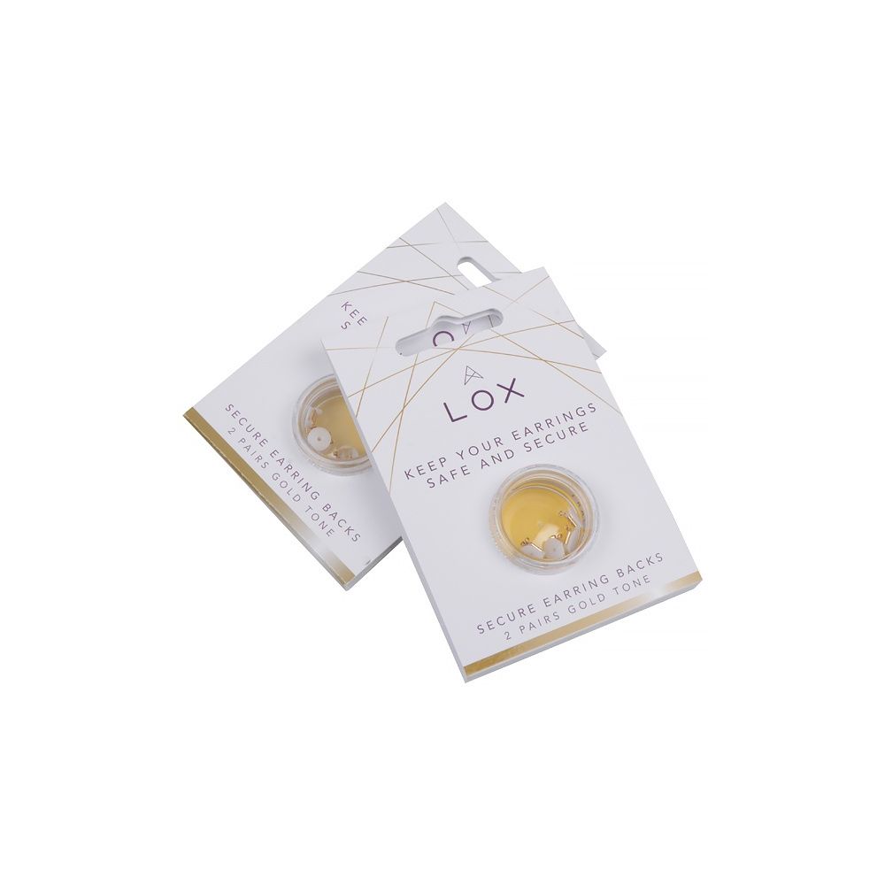 Want to ensure your earrings stay securely in place? These gold-tone LOX safety clasps give your stud earrings extra security. One set contains two pairs of gold-tone, nickel-free LOX backs, suitable for most stud earrings. The LOX clasps are very easy to use. You slide them behind your earring, just like a regular back. Once clicked, they stay securely in place, preventing your earrings from slipping out. To release them, gently squeeze the LOX and easily slide them off the stud. These gold-tone LOX safety clasps are ideal for earrings you cherish, such as gold studs, earrings with diamonds or gemstones, or that one set with special sentimental value. They are compact, comfortable to wear, and nearly invisible in the ear, yet they make a significant difference in how securely your earrings stay.