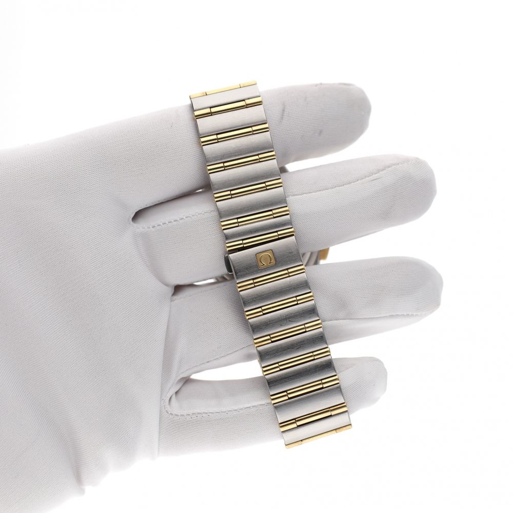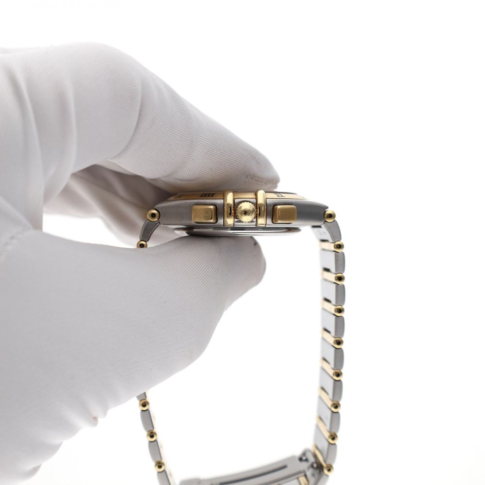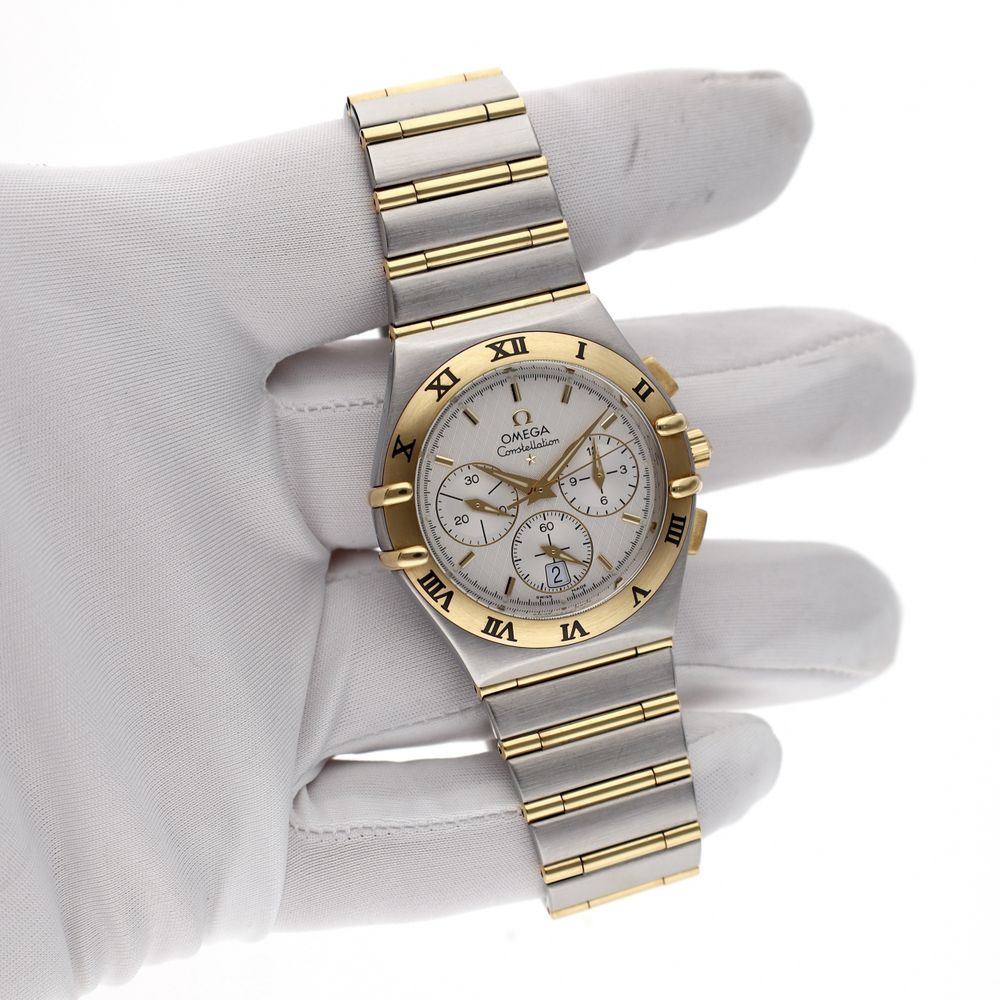 The Omega Constellation Double Eagle Chronograph, reference 1242.30.00, is crafted from stainless steel and 18-karat gold (full-bar version). The case and integrated bracelet create a recognizable Constellation look. The silver-colored dial features chronograph subdials, applied hour markers, and a date window. The watch is powered by the Omega Calibre 1270 MecaQuartz movement. This timepiece combines quartz timekeeping with a mechanical chronograph function, ensuring accurate timekeeping and direct operation of the stopwatch. This item is in very good condition and has been technically checked for correct functioning. Specifications: Reference: 1242.30.00 Movement: Omega Calibre 1270 MecaQuartz Case material: Stainless steel & 18 carat gold Strap: Stainless steel & 18 carat gold ('full-bar') Dial: Silver with chronograph subdials Functions: Hours, minutes, central seconds, date, chronograph Condition: Very good Delivered in our luxury in-house box with warranty report and 1 year warranty.