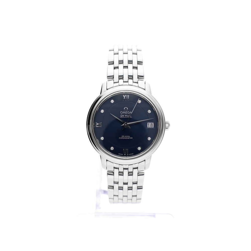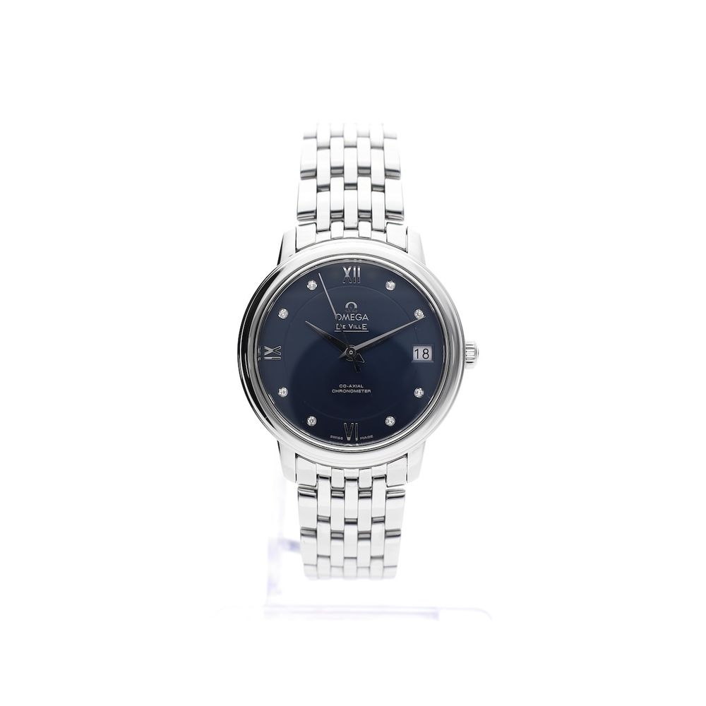 The Omega De Ville Prestige Co-Axial is an elegant women's watch that combines timeless beauty with high-quality Swiss watchmaking. This 33mm model is perfectly balanced; refined, wearable, and yet a clear eye-catcher with diamond indices. A fine all-rounder with sapphire crystal and a high-quality Swiss automatic movement. The watch is in excellent condition, both visually and technically, and comes as a beautiful full set from 2021. The last known retail price of this model was a whopping €4,799. The deep blue sunburst dial forms the heart of this watch, adorned with diamond indices that sparkle with every movement. The diamonds are certified, and a separate Omega "precious stones certificate" is included. The polished stainless steel case design and classic steel bracelet give it a luxurious yet versatile look, ideal for both everyday wear and formal occasions. The Omega Co-Axial Cal. The 2500 automatic movement runs perfectly and accurately, and features long service intervals thanks to Co-Axial technology. We measure an amplitude of 300 degrees and a deviation of up to 3 seconds per 24 hours, meaning the movement perfectly meets the Chronometer standard and factory specifications. The original Omega steel bracelet is very comfortable and fits wrists up to approximately 18 cm. The bracelet is also in excellent condition, and we can, of course, resize it. This watch comes as a beautiful full set from 2021, including: luxury Omega boxes, three Omega warranty cards, a purchase invoice from 2021, a manual, and our warranty report with a 1-year warranty.