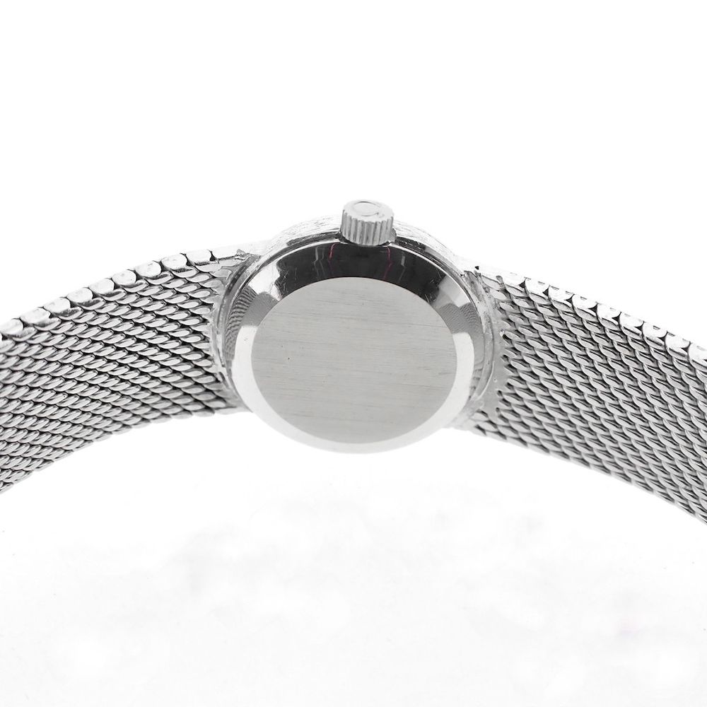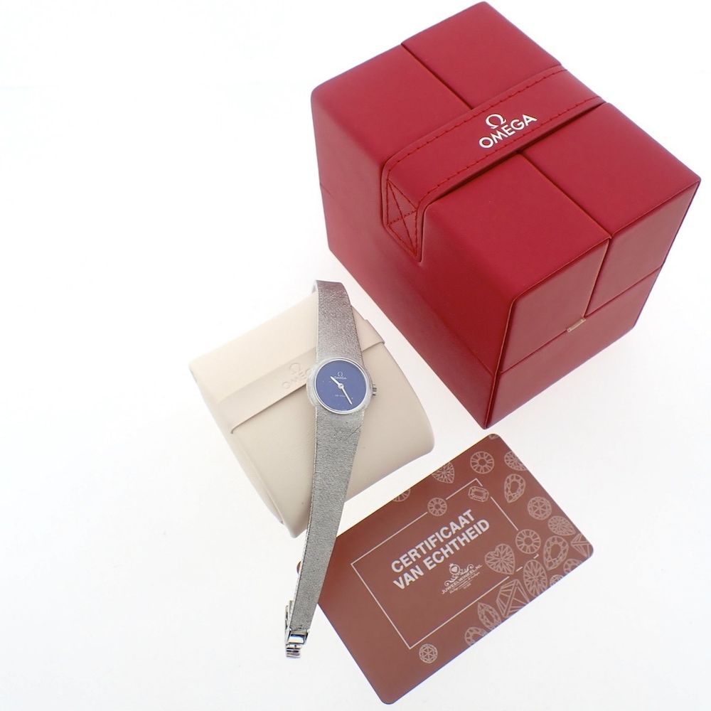 Fantastic white gold Omega Deville watch in 18k white gold. A beautiful vintage piece of jewelry, equipped with a very rare Lapis Lazuli dial. These so-called 'stone dials' are currently very popular and especially at Rolex we see bizarre increases in value just by having a Lapis Lazuli dial. Fortunately, with this Omega it is within limits. This type of watch is also called a 'cocktail watch' and was mainly worn for chic occasions or galas. The very good condition of the whole is striking. The unique dial or 'stone dial' with Omega logo is in beautiful condition. The 18k white gold 'Milanese' (or woven) strap is in beautiful condition, very comfortable to wear and has hardly any signs of wear. Equipped with a beautiful adjustable clasp and fits wrists from approximately 16.5cm to 18cm (can be shortened by us). The total weight is approximately 46 grams. This watch is equipped with a high-quality Swiss hand-wound Omega movement calibre 620 and runs perfectly. Comes with a luxury Omega box and our in-house warranty card with a 1-year guarantee.