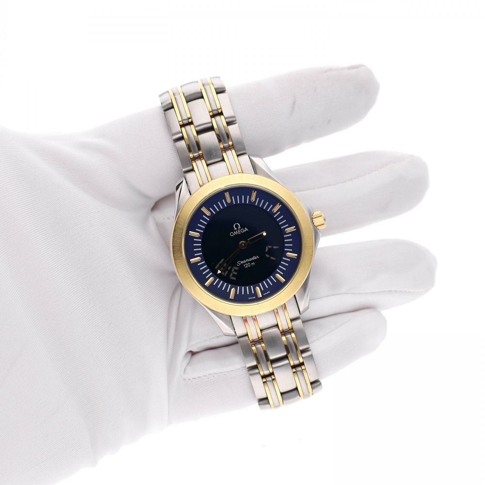 This vintage Omega Seamaster 120 Multifunction is a robust sports watch from the mid-1990s. It combines classic Seamaster DNA with practical everyday functionality in a rare edition and is in very good condition. The stainless steel case has a diameter of approximately 38 mm. The deep blue dial features luminescent hands and hour markers for optimal readability, complemented by an 18-karat gold bezel that is both functional and provides a sporty look. What sets this model apart is the multifunctional quartz movement. This provides reliable timekeeping with additional practical indicators. As we would expect from Omega, the timepiece is accurate, durable, and built to last. Key details: Brand: Omega Model: Seamaster 120 Multifunction Reference: 2321.81.00 Year: Circa 1996 Case material: Stainless steel Dial: Blue Movement: Quartz, multifunction Strap: Gold/steel, in very good condition and suitable for wrists up to 20 cm An authentic vintage Omega with a bold design, proven reliability, and enduring appeal. Delivered in our luxury box including warranty report and a 1-year warranty. Specifications