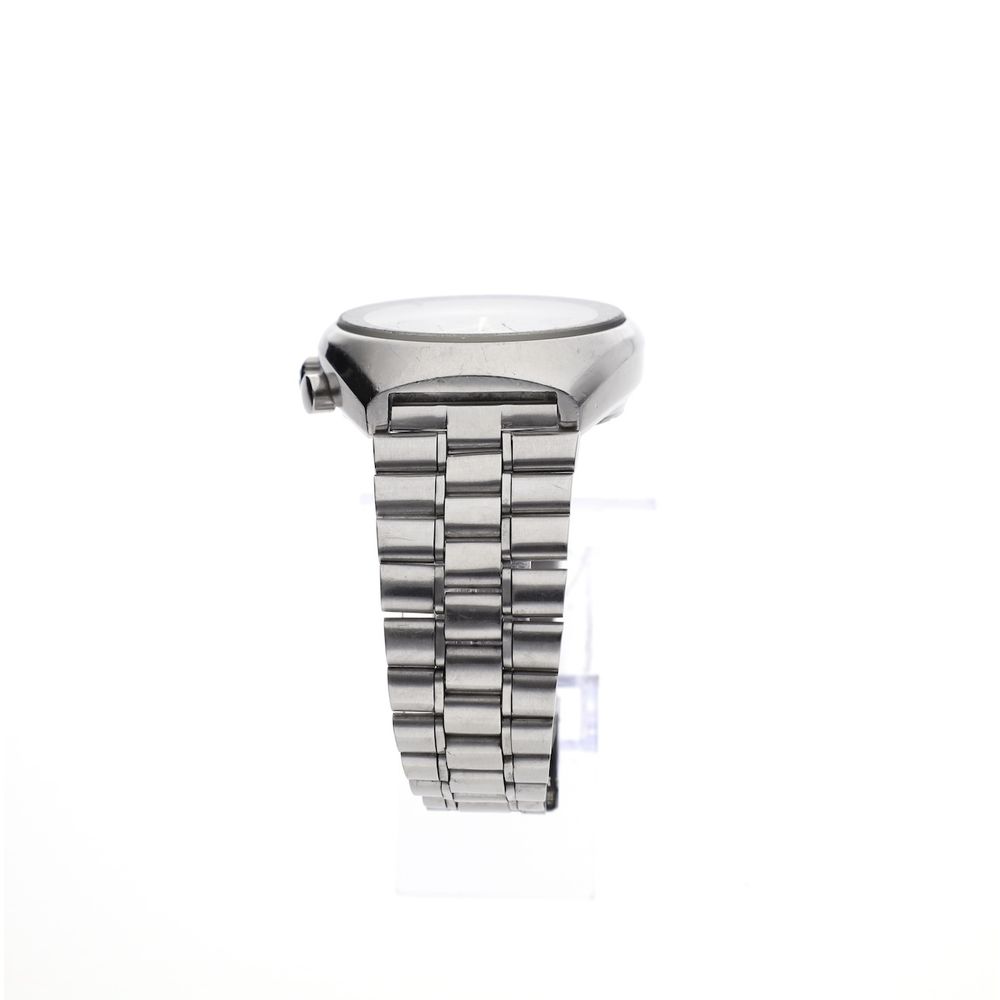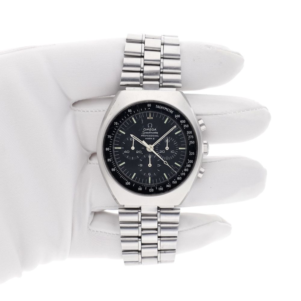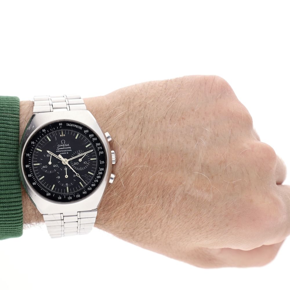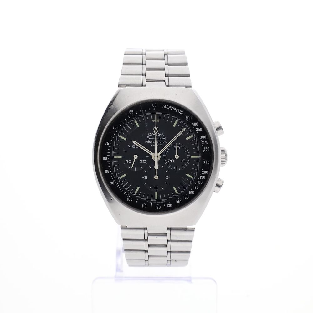This Omega Speedmaster Mark II from circa 1970 is utterly vintage! A beautiful example with the original dial and hands, a lovely patina, a 42mm cushion case, and a typical vintage 70s vibe. This watch is in vintage condition and completely original. This is vintage with character, patina, and signs of wear, not surprising after some 55 years. The Omega Speedmaster Mark II is a legendary chronograph watch that holds an important place in Omega's watchmaking history. Designed as a racing watch, the Mark II features a streamlined case and a tachymeter scale on the bezel. This was such an important model for Omega that a heritage (remake) of this original model was even released in 2015. The Speedmaster Mark II's signature feature is the tonneau-shaped case, which gives it a sleek and sporty look. The case dimensions are slightly larger than those of the Speedmaster Moonwatch, with a diameter of 42.4mm. The Speedmaster Mark II is powered by Omega's renowned caliber 861, a legendary mechanical movement. The movement also features a chronograph function. It runs smoothly and accurately, with a measured amplitude of approximately 270 degrees and a deviation of 5 seconds per 24 hours. The original Omega ref. 1159 steel bracelet is in good condition and fits wrists of up to approximately 20 cm when all links are used (two separate links are included). The bracelet is otherwise very wearable and certainly reflects its 55 years of service. This vintage watch comes with an original, vintage Omega box and an in-house warranty report with a 1-year warranty.