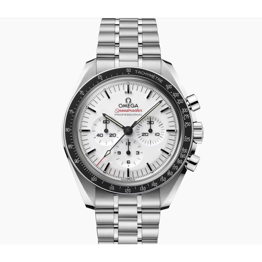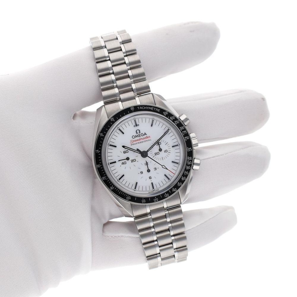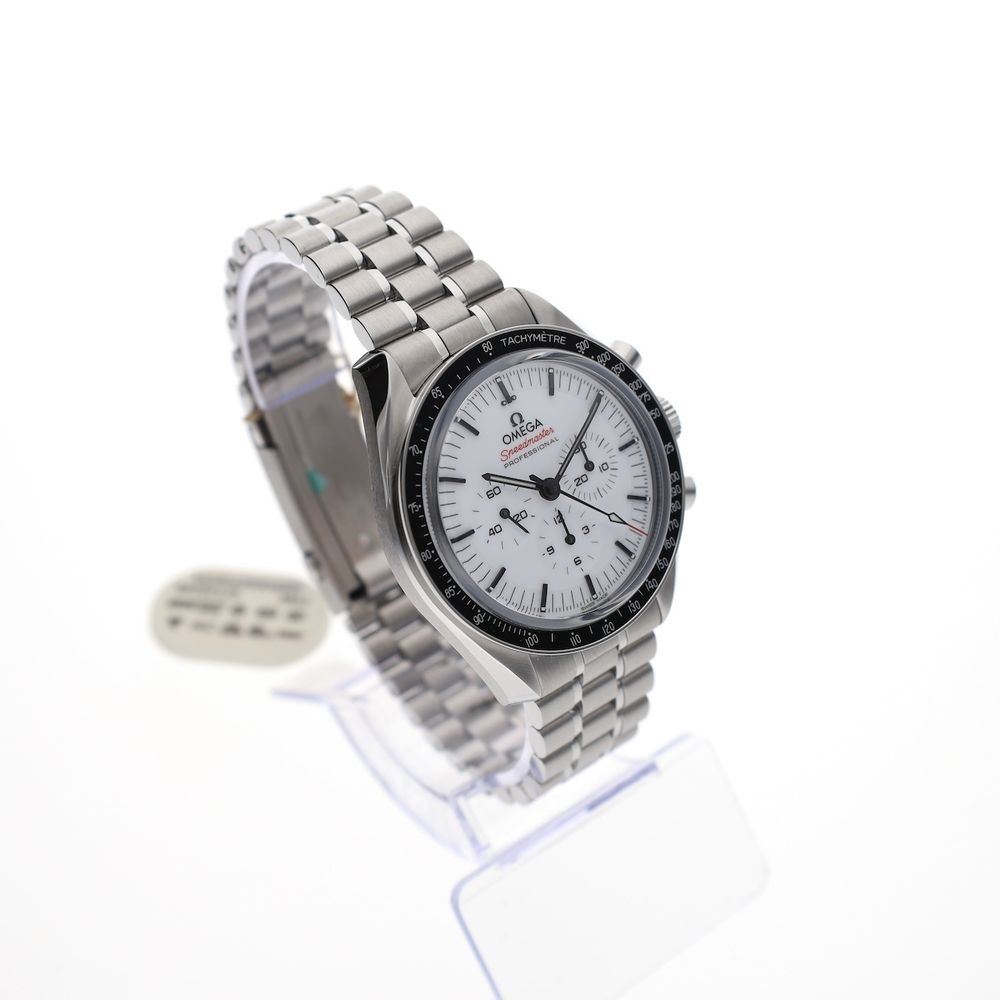 What a legend! The Omega Speedmaster Moonwatch Professional 'Double Sapphire' in white, the Omega surprise of 2024. This is the Omega Speedmaster 'moonwatch,' but with some striking upgrades such as sapphire crystal on the front and back, an applied Omega logo on the sleek white dial, and a very comfortable steel strap with polished center links and the new 'push' quick-adjust clasp. An absolutely top-notch watch for every day and a jewel to wear. This watch is brand new (card stamped 07-2025), in a beautiful full set, and includes over 4.9 years of Omega factory warranty. The current retail price for this model is a whopping €9,000, so we have an option on this very popular watch at a nice discount. This Omega Speedmaster Moonwatch with a 42mm diameter is equipped with the latest updates and technology from the Swiss watch industry in numerous areas. A truly top-of-the-line model and a beautiful upgrade to the Speedmaster line over the past 70 years. Not for nothing, a worthy Rolex Daytona counterpart with an equally impressive history. At the heart of this Omega Speedmaster is Omega's latest caliber 3861, the famous manual movement with the latest technology, Co-Axial Escapement (meaning less servicing), fully anti-magnetic, and accurate to the highest METAS standards. We measured the movement and found an ideal 300-degree amplitude and an astonishing 0-second/24-hour deviation. The bracelet has also changed somewhat; this latest model is equipped with the latest and highly praised type of steel bracelet and wears wonderfully and matches perfectly. All links are included, as they should be and were delivered new. This model also features a convenient push-button quick-set. This watch comes as a beautiful full set, just as it was when it was released in stores in 07-2025. Full set with box (Omega 2025 Box Set), 3 Omega warranty cards, all links in the bracelet, Omega booklet, and manual. This beautiful set still has over 4.9 years of Omega factory warranty!