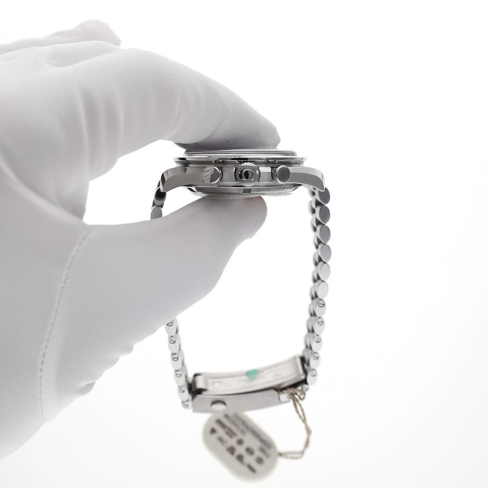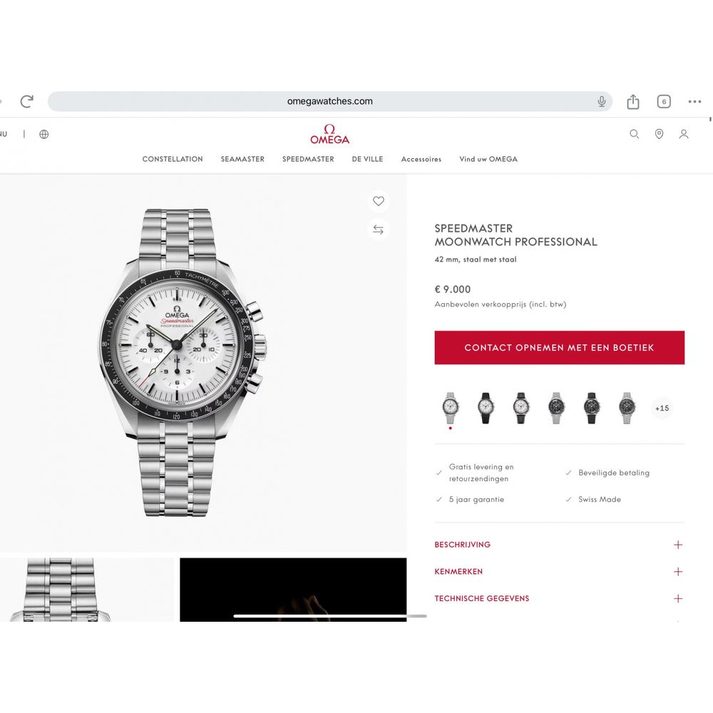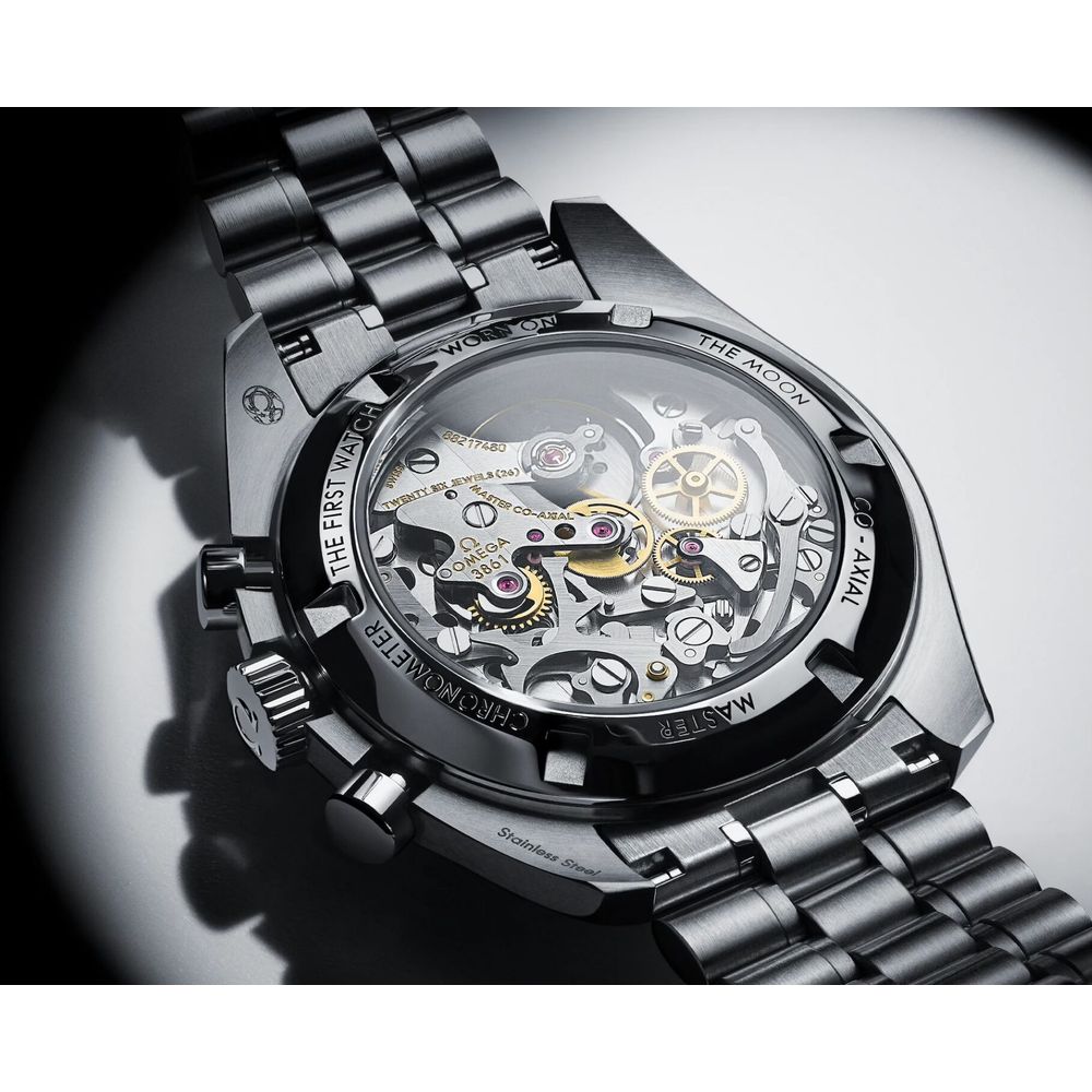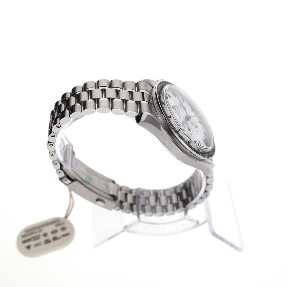 What a legend! The Omega Speedmaster Moonwatch Professional 'Double Sapphire' in white, the Omega surprise of 2024. This is the Omega Speedmaster 'moonwatch,' but with some striking upgrades such as sapphire crystal on the front and back, an applied Omega logo on the sleek white dial, and a very comfortable steel strap with polished center links and the new 'push' quick-adjust clasp. An absolutely top-notch watch for every day and a jewel to wear. This watch is brand new (card stamped 07-2025), in a beautiful full set, and includes over 4.9 years of Omega factory warranty. The current retail price for this model is a whopping €9,000, so we have an option on this very popular watch at a nice discount. This Omega Speedmaster Moonwatch with a 42mm diameter is equipped with the latest updates and technology from the Swiss watch industry in numerous areas. A truly top-of-the-line model and a beautiful upgrade to the Speedmaster line over the past 70 years. Not for nothing, a worthy Rolex Daytona counterpart with an equally impressive history. At the heart of this Omega Speedmaster is Omega's latest caliber 3861, the famous manual movement with the latest technology, Co-Axial Escapement (meaning less servicing), fully anti-magnetic, and accurate to the highest METAS standards. We measured the movement and found an ideal 300-degree amplitude and an astonishing 0-second/24-hour deviation. The bracelet has also changed somewhat; this latest model is equipped with the latest and highly praised type of steel bracelet and wears wonderfully and matches perfectly. All links are included, as they should be and were delivered new. This model also features a convenient push-button quick-set. This watch comes as a beautiful full set, just as it was when it was released in stores in 07-2025. Full set with box (Omega 2025 Box Set), 3 Omega warranty cards, all links in the bracelet, Omega booklet, and manual. This beautiful set still has over 4.9 years of Omega factory warranty!