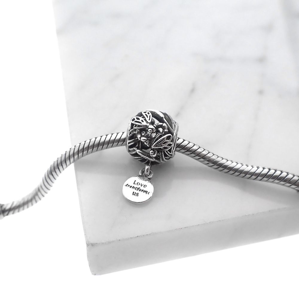Pandora charm; Silver; Love Transforms Us