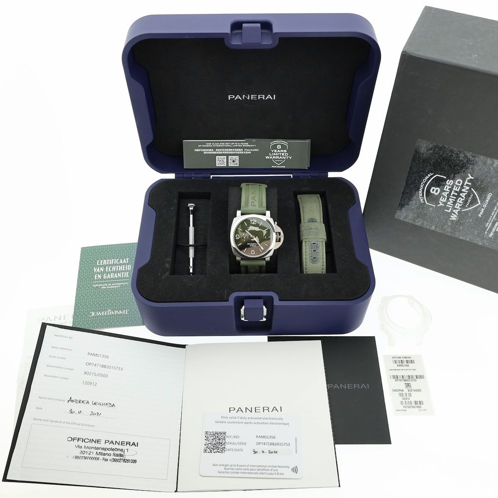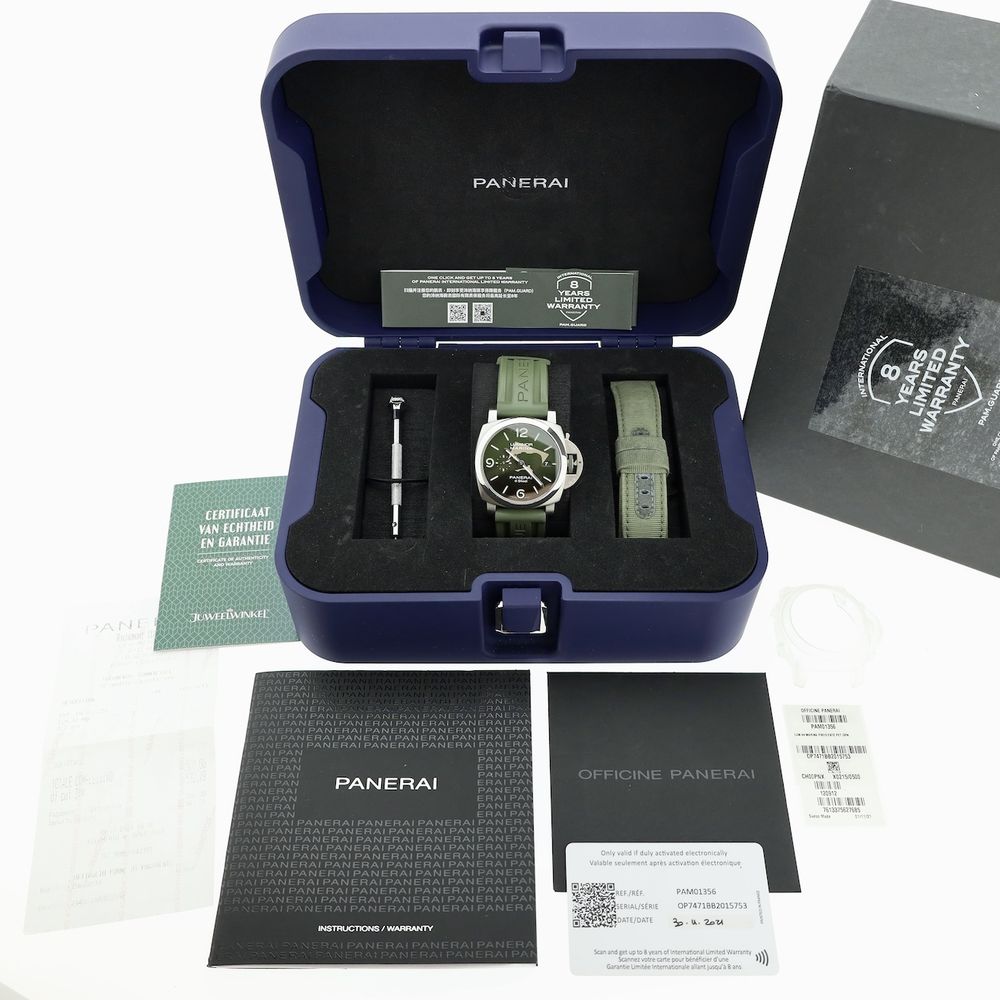 Panerai Luminor Marina Verde Smeraldo: Italian craftsmanship with an emerald twist. The Panerai Luminor Marina PAM01356 is a sturdy and refined automatic men's watch that combines classic Luminor features with a striking emerald sunburst dial. The "Verde Smeraldo" color gives this watch an exclusive look, elegant yet unmistakably present. Ideal for those who want to combine style with character. Typical Panerai with the sturdy 44mm case and patented crown with its signature locking mechanism. With its 44mm and short lugs, it's a comfortable watch that certainly stands out thanks to the emerald green "sandwich" Luminor dial, wide lugs, and beautiful details. Furthermore, the Luminor models' luminosity is truly unsurpassed and present. This watch is in good condition and comes as a beautiful full set from 2021 with two original Panerai straps. Panerai, a brand originally known for its watches for the Italian Navy, has created an iconic line with the Luminor collection, recognizable for its robust design and innovative features. The PAM01356 is a beautiful example of this tradition, with an impressive 72-hour power reserve and a stylish, functional design. This watch is powered by a Swiss-made caliber P.9010 Manufacture automatic Panerai movement. The movement runs perfectly and accurately, and we measure excellent power values: an amplitude of 290 degrees and a deviation of a maximum of 2 seconds per 24 hours, which is truly excellent. This watch comes on a comfortable green Panerai rubber strap that is in excellent condition and features the Panerai-signed buckle. It also comes with a Panerai nylon/leather strap that has been worn a bit more (but is still perfectly wearable). This watch will certainly work well on a wide variety of straps, something Panerai is known for, and the original strap-changing tool is also included. This watch comes as a beautiful full set from 2021, including: Panerai box, outer box, Panerai warranty papers and card, manual, Panerai screwdriver, extra nylon strap, case/bezel protector, and in-house warranty report with a 1-year warranty.