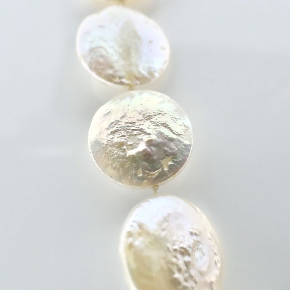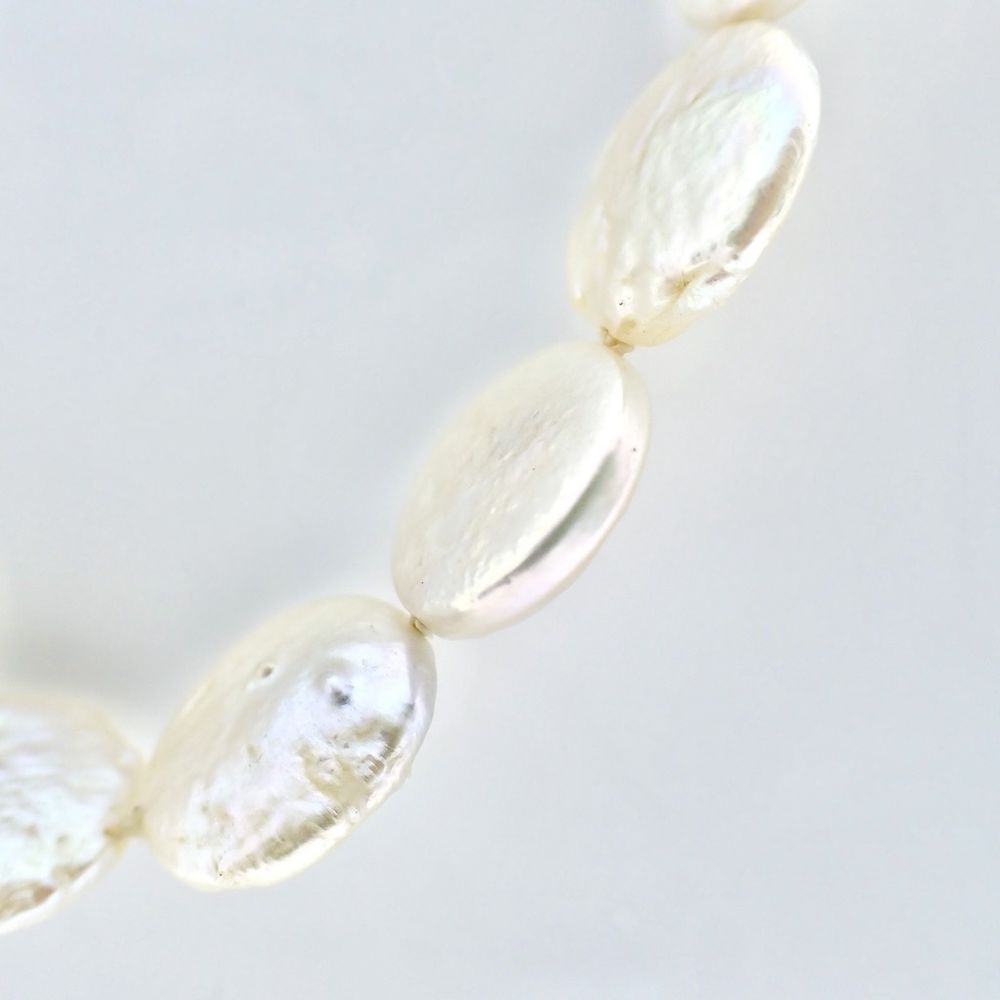 Necklace made of a single strand of flat pearls. These pearls have a natural appearance because they are not perfectly smooth. The pearls, approximately 12.0 mm in diameter, are strung on a rope. The necklace closes with a 14-karat gold (585/1000) clasp set with a diamond. A beautiful women's necklace.