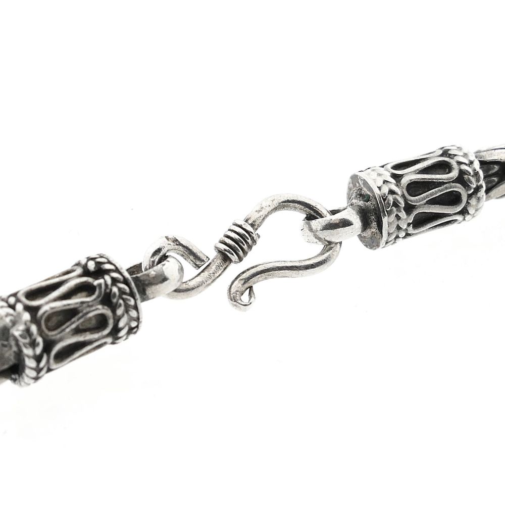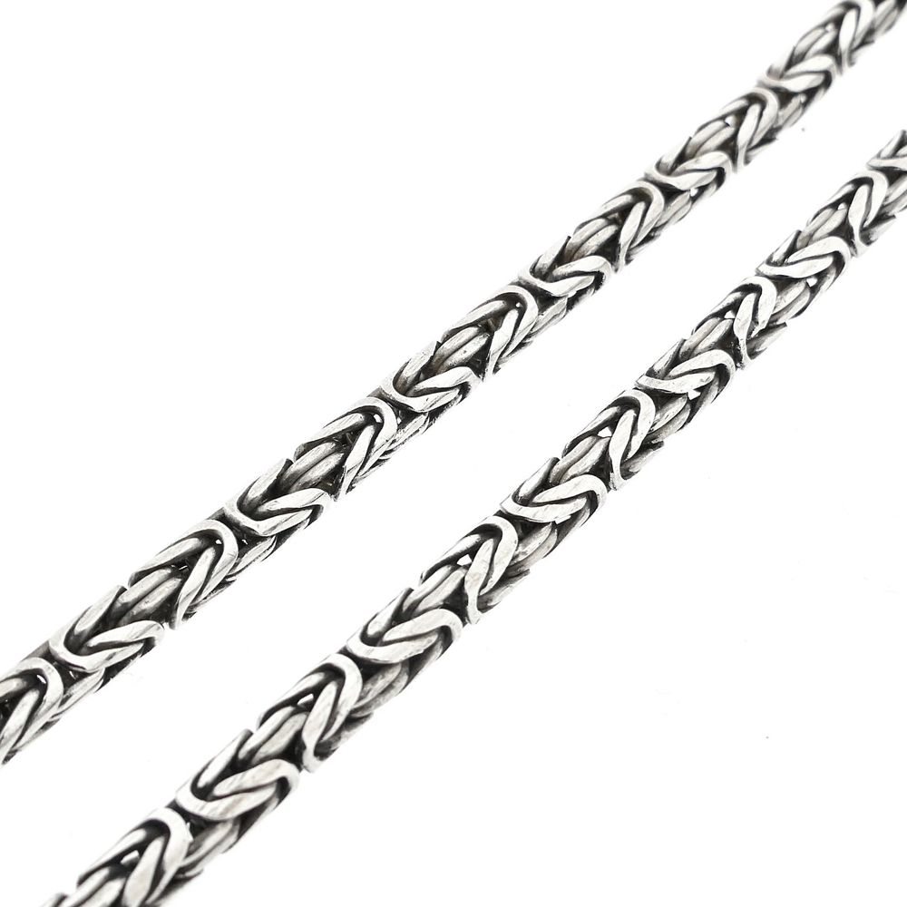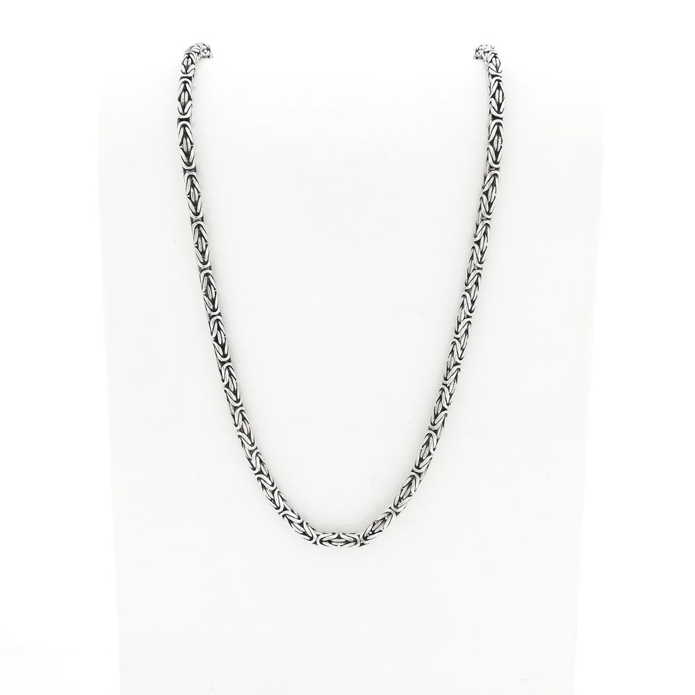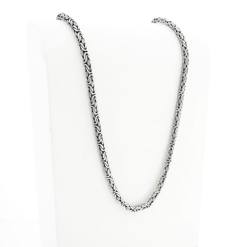 Robust silver chain made with king links. This type of link dates back to the 5th century! The link work looks complex and luxurious. The links are solid and have a width of 4.4 mm. A beautiful piece of jewelry for the neck. The chain fastens with a spring ring clasp and is made from first-grade silver (925/1000).