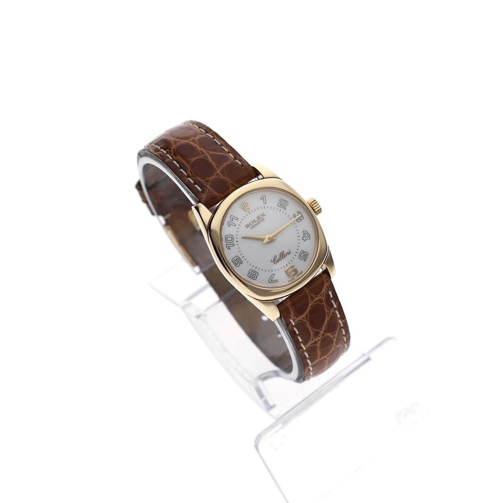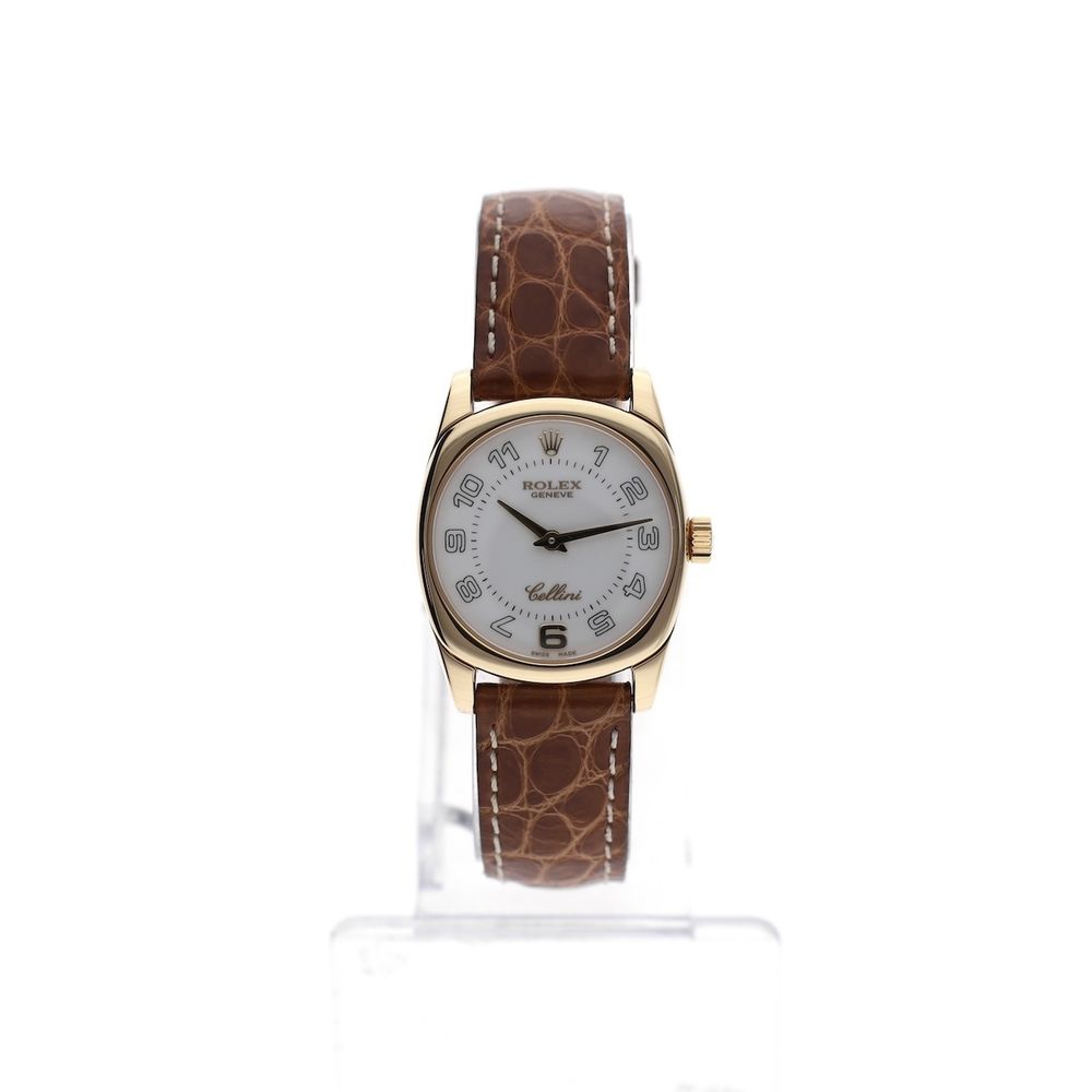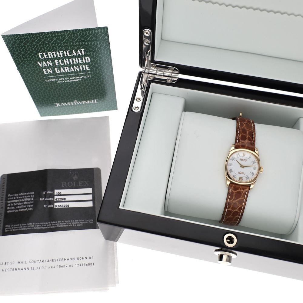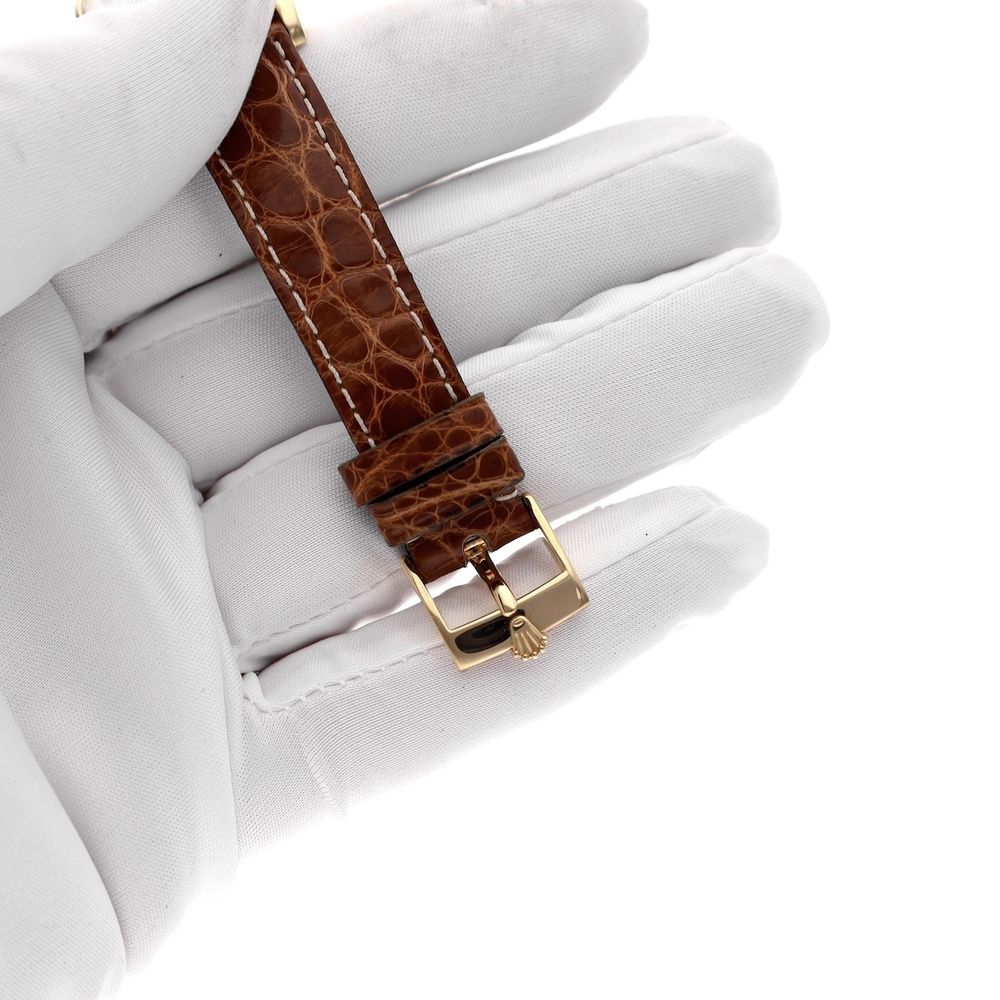 The Rolex Cellini 6229/8 is a stylish and elegant women's classic from Rolex's refined Cellini collection. The Cellini line focuses on classic, timeless designs with a luxurious appearance. This women's Rolex Cellini, crafted in 18k yellow gold, is a lovely vintage Rolex from 2001. A classic women's watch measuring 26mm x 31mm. The white guilloché dial features applied gold indices, making it a real eye-catcher. This watch is in excellent condition and comes with a 2009 appraisal report (€3710 at the time) and a copy of the original Rolex papers. This Rolex watch is equipped with a high-quality Manufacture Rolex cal. 6621 quartz movement that runs excellently. The movement was fitted with a new battery in 08-2025 and runs excellently and accurately. The original Rolex crocodile leather strap is beautiful, in excellent condition, and features the 18k yellow gold Rolex buckle to complete the look. This watch comes with a luxury in-case box, outer box, copy of Rolex documentation, appraisal report, and our warranty report with a 1-year guarantee.