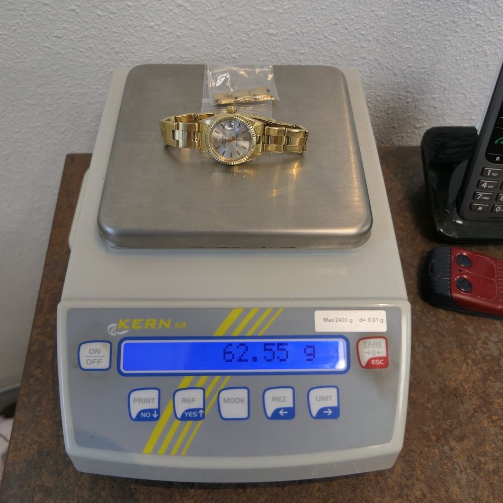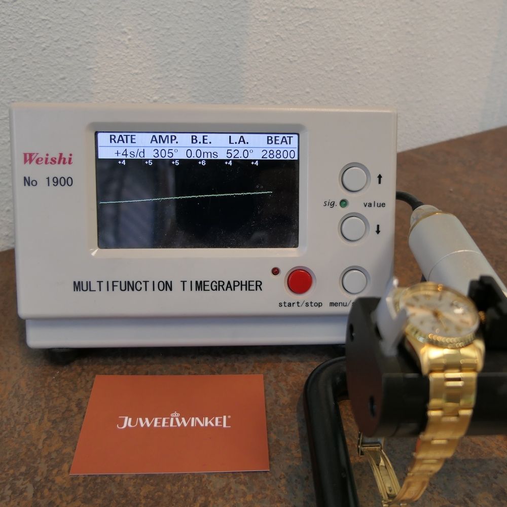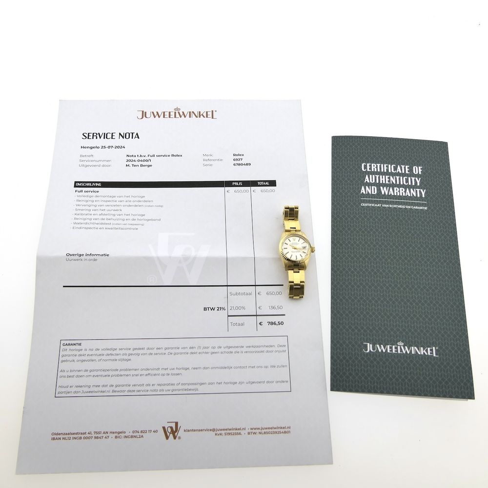 Top vintage, this Rolex Lady-Datejust 6927 in the refined ladies' size of 26mm and made entirely of 18k yellow gold. A vintage watch from 1982, made even more special by the beautiful full set it comes with. This is truly rare! We couldn't get a good photo of this lovely watch, but it's definitely worth it. It's in excellent condition and comes with a new full service (invoice included), Rolex warranty papers, a hangtag, extra 18k gold links, and a Rolex box. This Rolex women's watch with its elegant fluted bezel and 18k yellow gold Oyster rivet bracelet is a true Rolex classic and a jewel for almost any woman's wrist. The Lady-Datejust offers a perfect balance between luxury and functionality, making it an ideal companion for any woman who appreciates timeless class, style, and exceptional quality. Whether it's a formal occasion or a casual day out, the Lady-Datejust 6927 always adds refinement to any look. This watch comes on the original 18k gold Rolex Oyster rivet bracelet with matching '66' end links. The bracelet fits links up to approximately 18.5cm wrists (three separate 18k gold links are included). The bracelet is in good condition, has some slight stretch, but is completely ready for a new life! Inside, the Rolex Cal. 2035 automatic movement runs perfectly and accurately. We measure an amplitude of 305 degrees and a deviation within current strict COSC standards of max. +4 sec./24h. Not bad at all, we had the movement fully serviced for a whopping €786, and the invoice is included. The watch is therefore in excellent, well-maintained condition and will not require any maintenance for years to come. This watch comes as a unique full set with original (vintage 80's) Rolex box, Rolex warranty paper, hangtag, 3x extra links, service note (07-2024 at €786,-) and in-house warranty report with 1 year warranty.