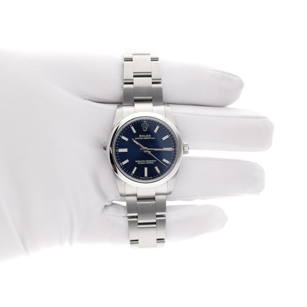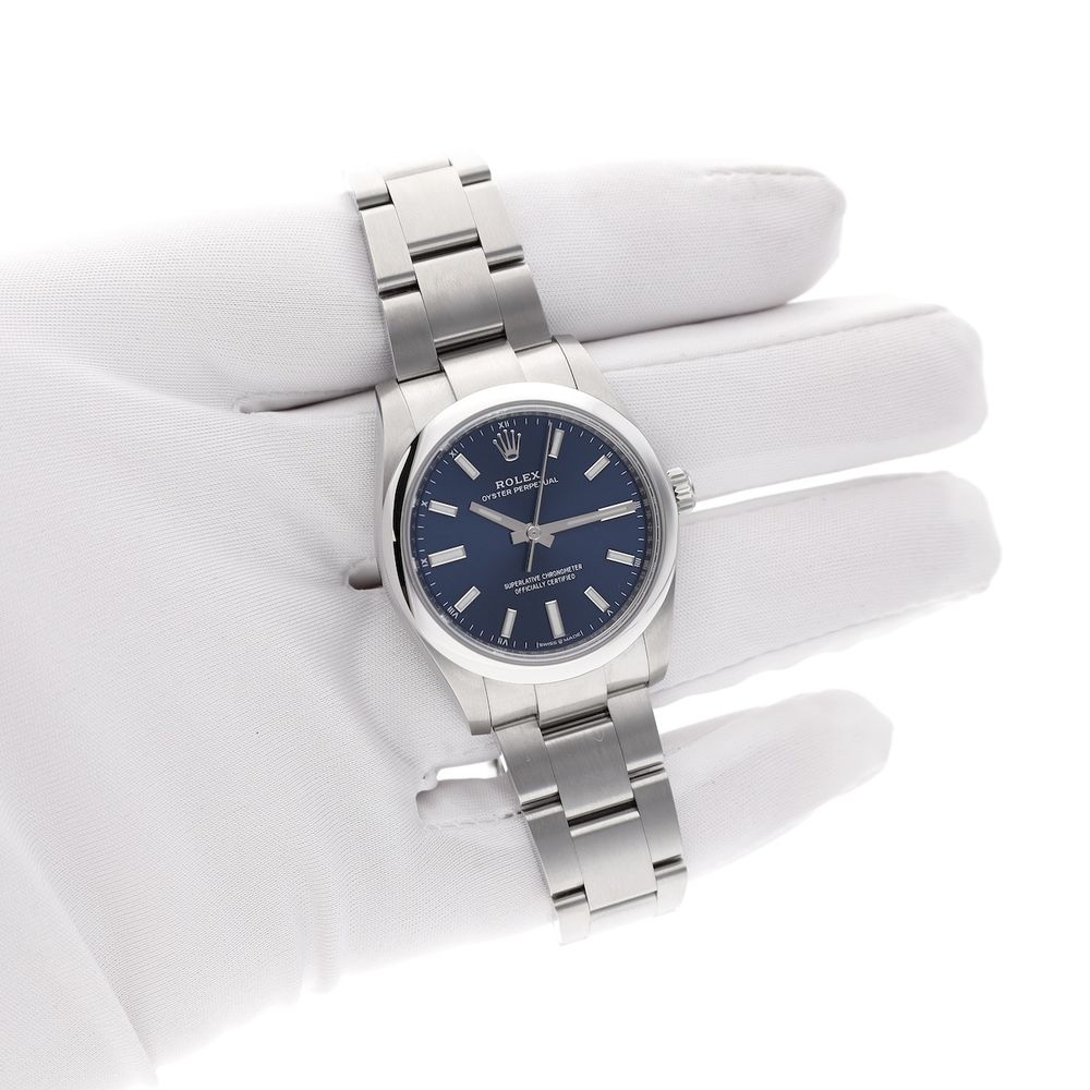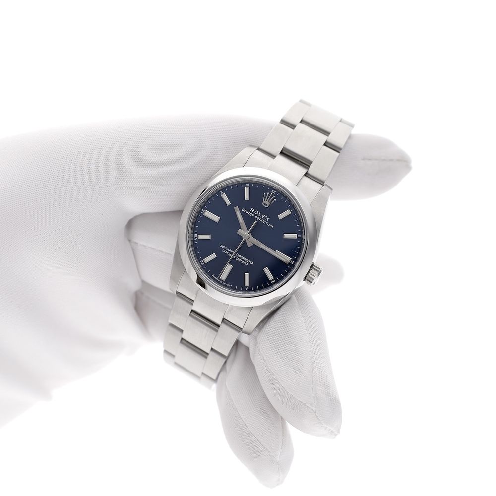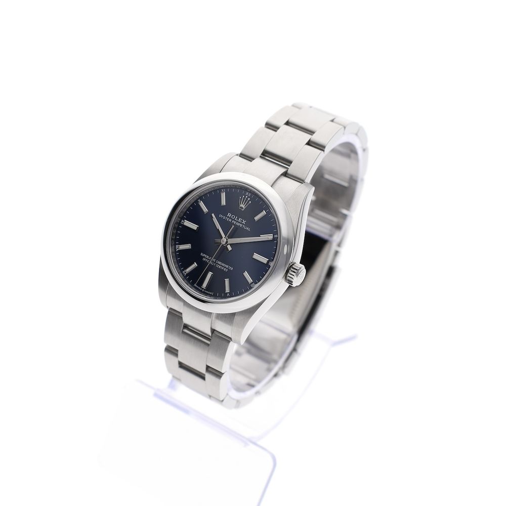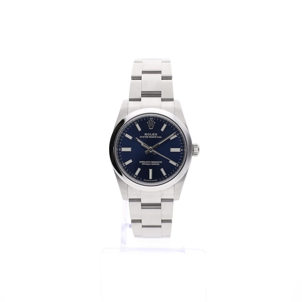 Timeless class with a modern twist. The Rolex Oyster Perpetual 34mm, reference number 124200, perfectly exemplifies everything Rolex stands for: precision, elegance, and durability. This model is sleek, versatile, and designed for those who appreciate understated luxury. With a diameter of 34mm, this watch is ideal for both men and women seeking a classic size with modern flair. The Rolex Oyster Perpetual 34mm features the popular blue sunburst dial. At 34mm, it's a unisex model and a perfect everyday watch without any frills. This watch is new and unworn from 2021. It comes as a beautiful full set. The current list price is €6,100. It has everything for Rolex connoisseurs: Rehaut engraving, a laser-edged crown at 6 o'clock, and everything a true Rolex should have. This Rolex is equipped with the latest and most recent automatic Rolex caliber 2230 with a 55-hour power reserve. Naturally, it runs like a Rolex, with perfect timing and extreme accuracy, with a maximum deviation of -2/+2 seconds per 24 hours. This Rolex watch was delivered in the Netherlands in 2021 and is completely unworn. It comes complete with all accessories as it was when it was new: Rolex box, outer box, Rolex warranty card, hangtag, booklets, and wallet. In addition, our in-house warranty report with a 1-year warranty is included.