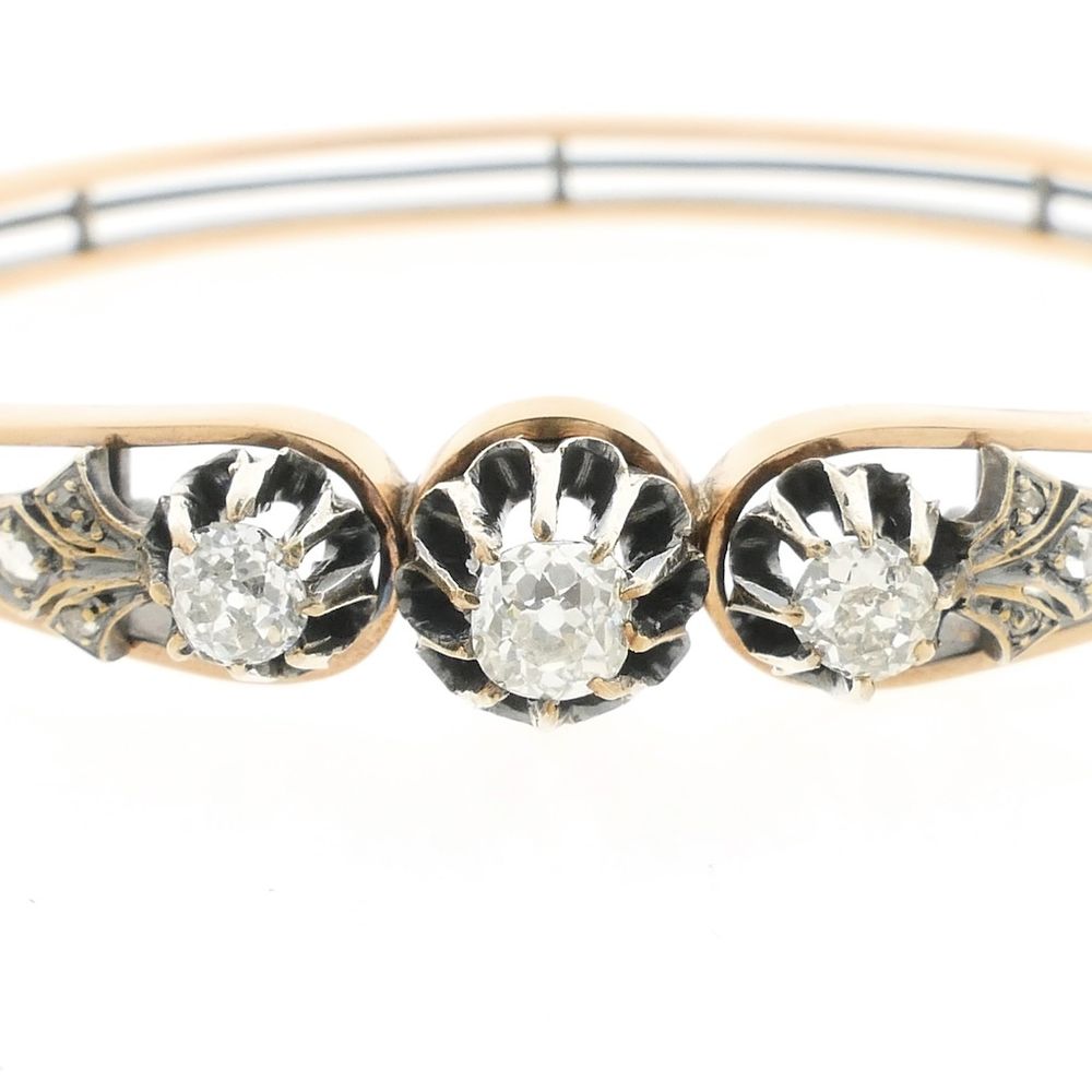 Gold bangle with a Victorian design. The links are open, with three large brilliant-cut diamonds set in high chatons of white gold on each end. These diamonds are complemented by elegant workmanship, including rose-cut diamonds. The bracelet closes with a box clasp and safety chain and is crafted from 14-karat rose gold (585/1000).