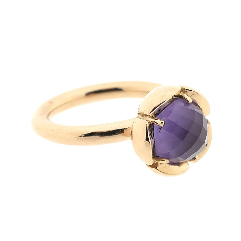Gold ring from the BRON brand, from the "Catch" family. An exclusive and luxurious ring suitable for any occasion. The round facet-cut amethyst has a diameter of 7.9 mm. The stone is surrounded by leaves, creating a floral design. The ring is crafted from 18-karat rose gold (750/1000).