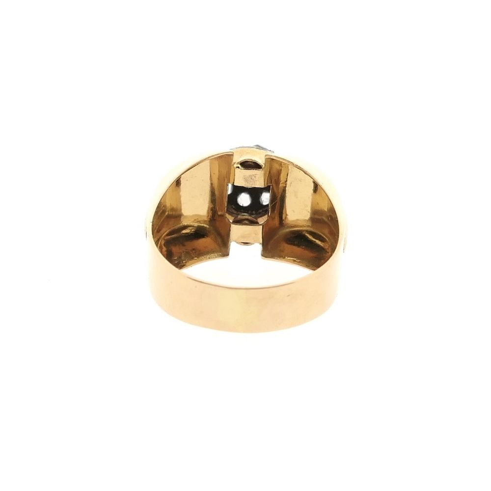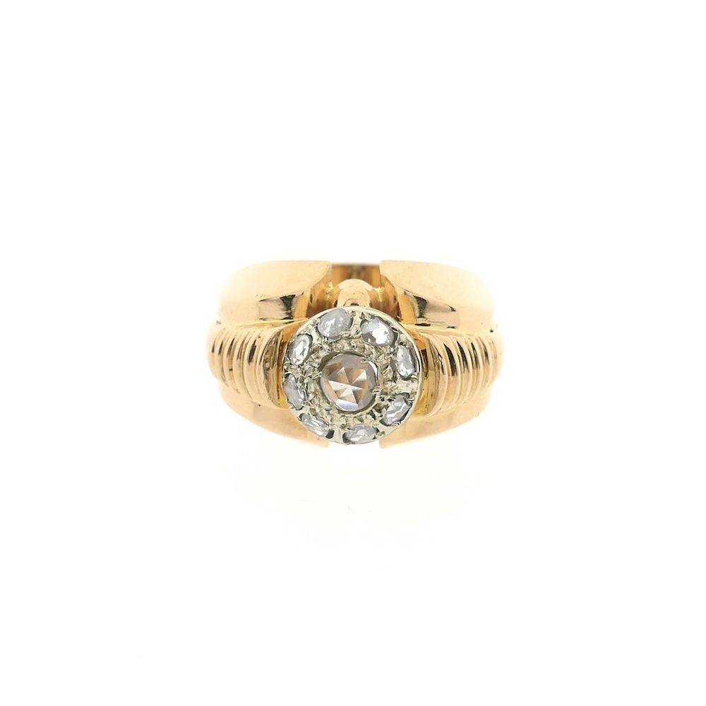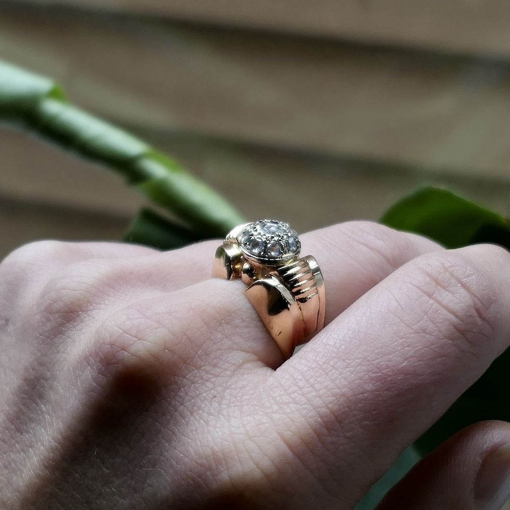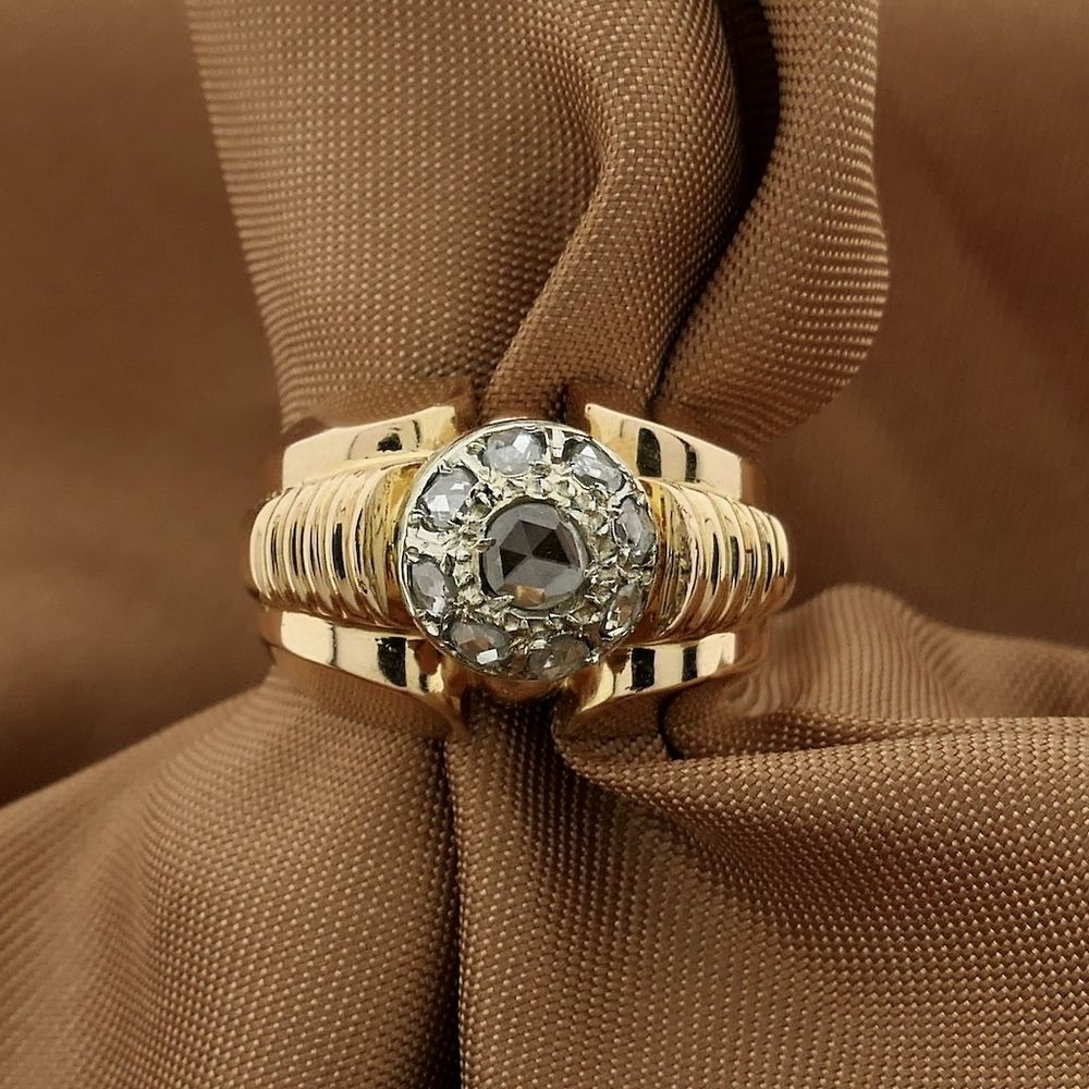 Rose gold entourage ring with rose-cut natural diamonds. The diamonds have a total weight of 0.25 ct and are set in white gold. This stunning ring is crafted from 18-karat rose gold (750/1000).