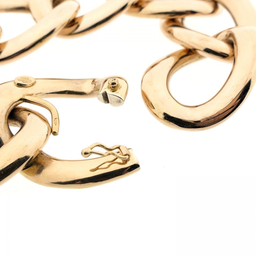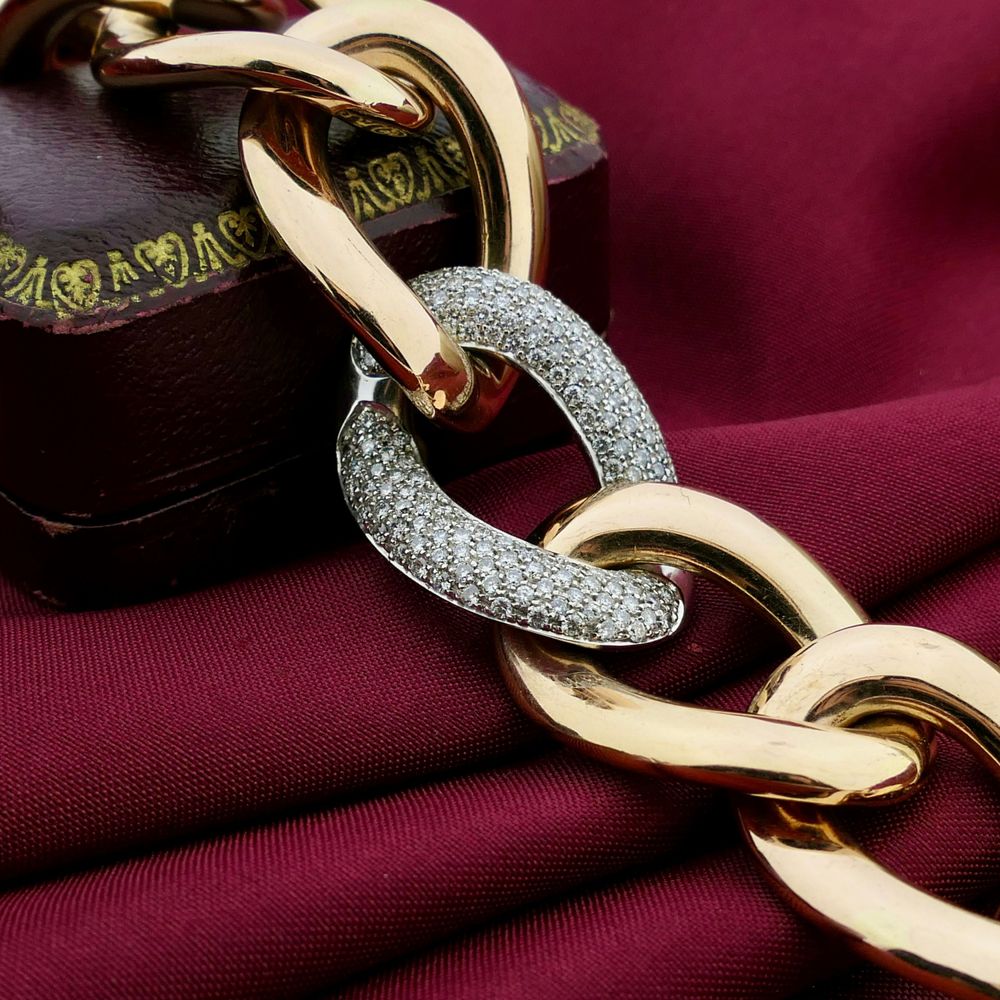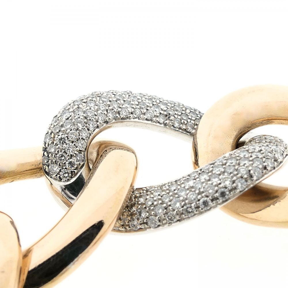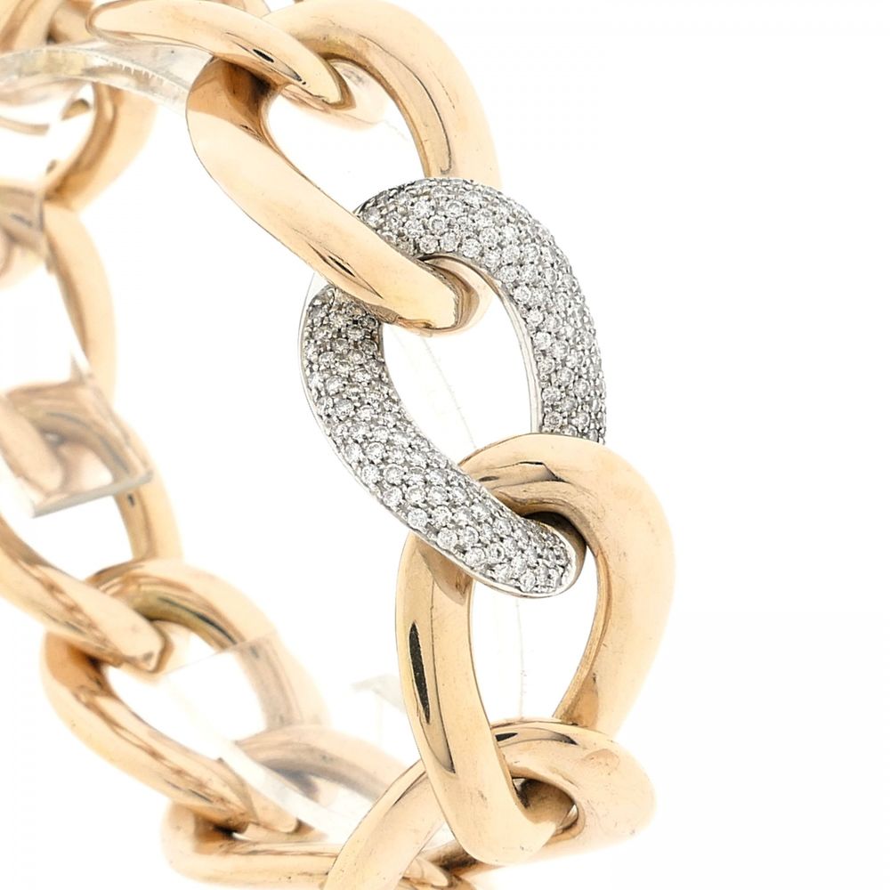 Rose gold bracelet made with large gourmet links. The bracelet has one white gold link with a total of 0.72 ct. of diamonds, the rest have a smooth finish. The bracelet is made of 14-karat rose gold (585/1000).