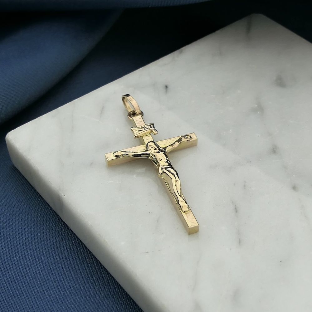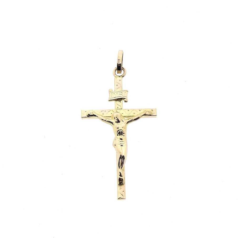 Gold pendant of the cross of Jesus with a detailed corpus. A small sign with INRI is carved at the top of the cross, which means "Iesus Nazarenus, Rex Iudaeorum" (Jesus of Nazareth, King of the Jews, in Latin). The pendant has a polished finish and is made of 14-karat rose gold (585/1000).