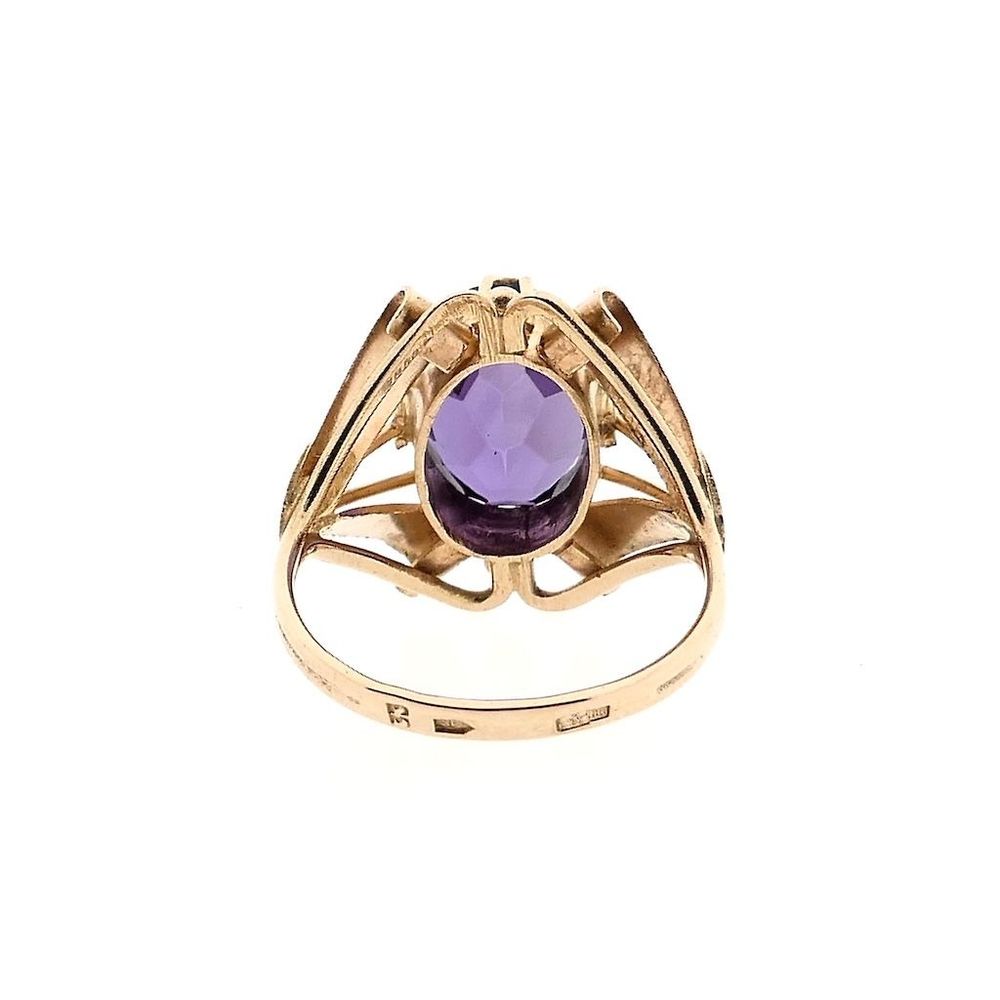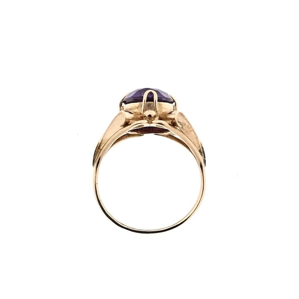 Rose gold ring set with a synthetic gemstone. The purple/blue stone is crystal clear and slightly translucent. This beautiful ring is crafted from 14 karat rose gold (585/1000).