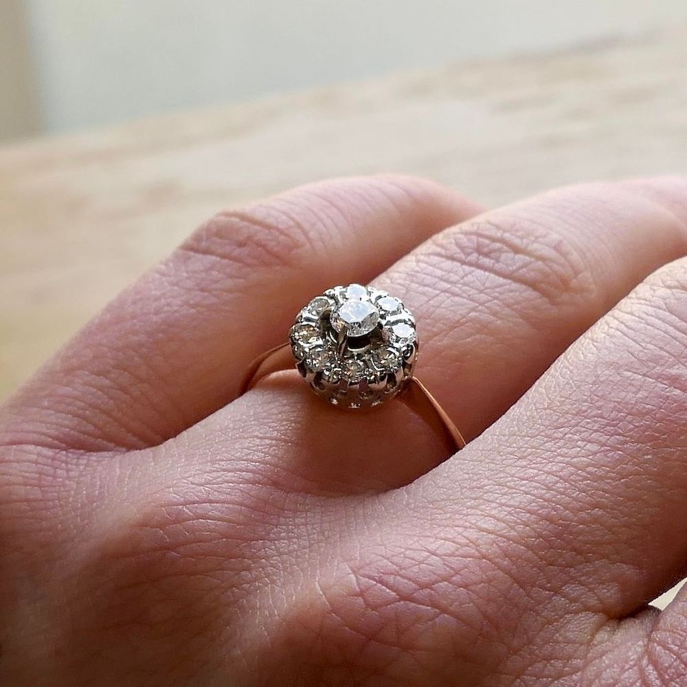 Rose gold ring set with a cluster of natural brilliant-cut diamonds. The ring has an elegant appearance and is crafted from 14-karat rose gold (585/1000).