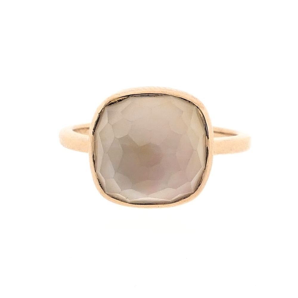 Gold ring set with a moonstone. The moonstone is square-cut with a faceted curve, and a layer of mother-of-pearl is visible on the underside, creating beautiful colors when reflected in the light. The ring is crafted from 14-karat rose gold (585/1000).
