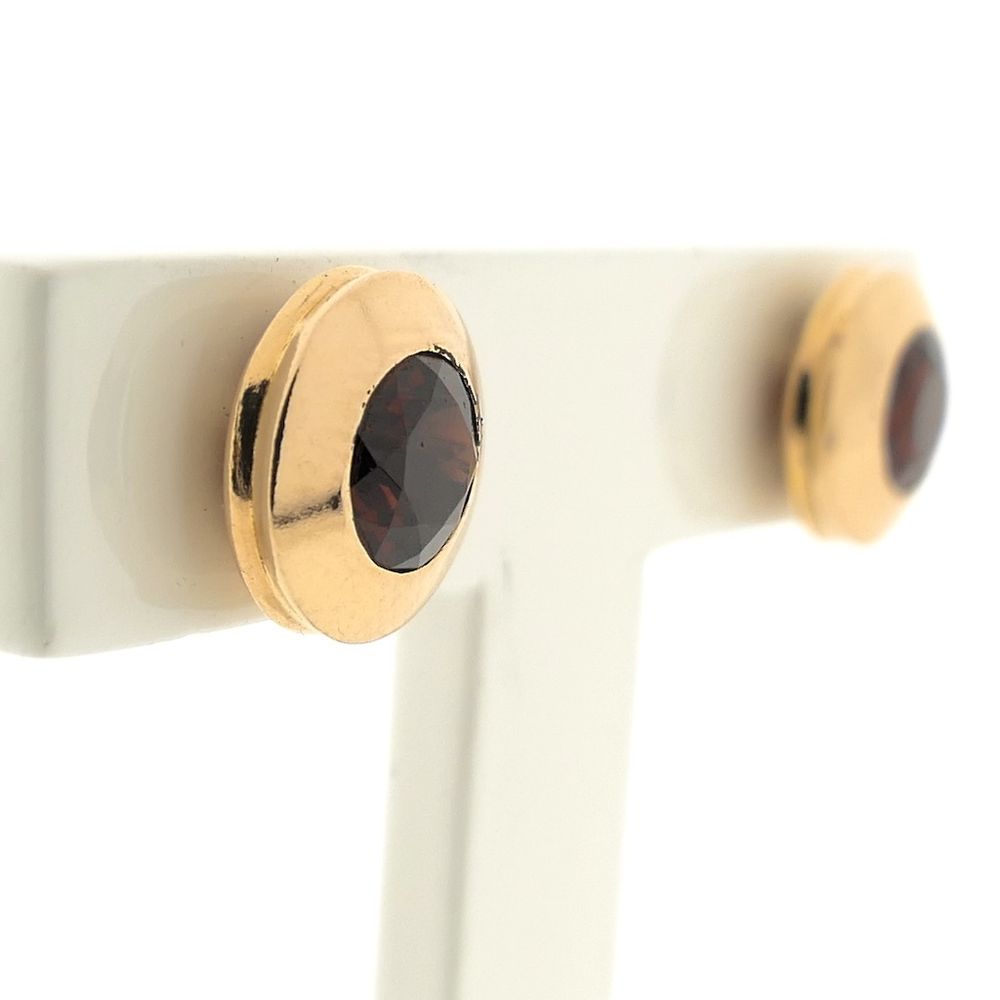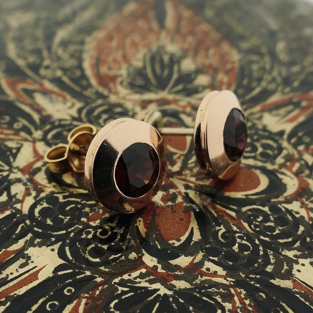 Rose gold stud earrings set with garnet stones. A subtle and elegant set crafted from 14-karat rose gold (585/1000).