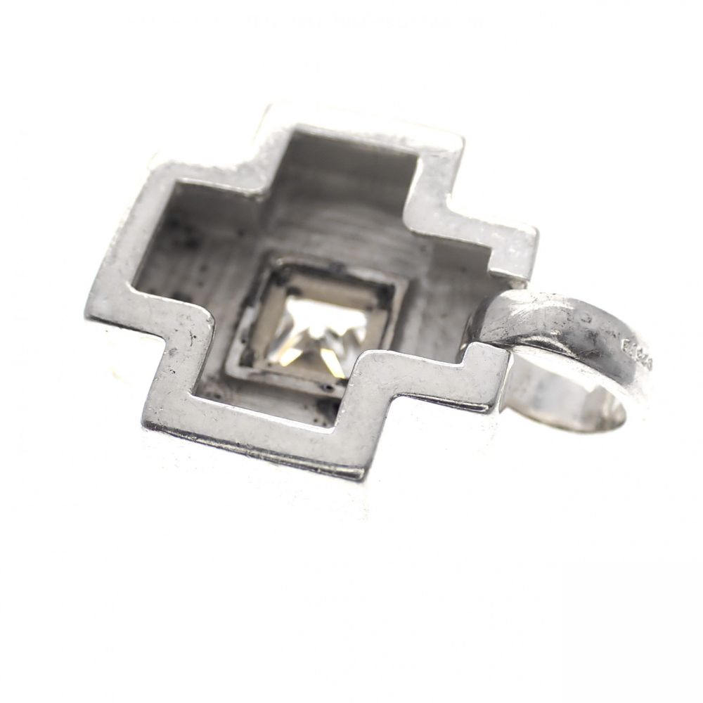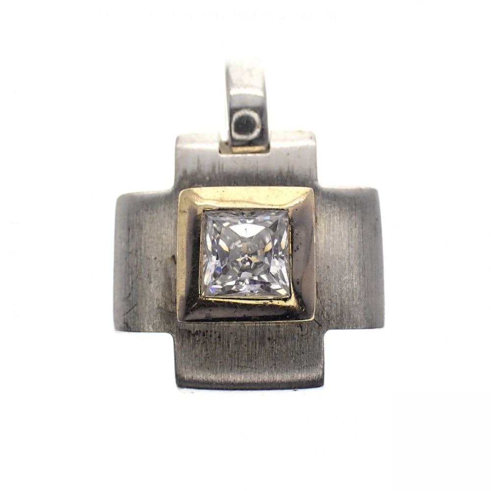 Matte silver cross pendant with a princess-cut zirconia stone. The setting is plated with yellow gold. The pendant is made of 925/1000 sterling silver.