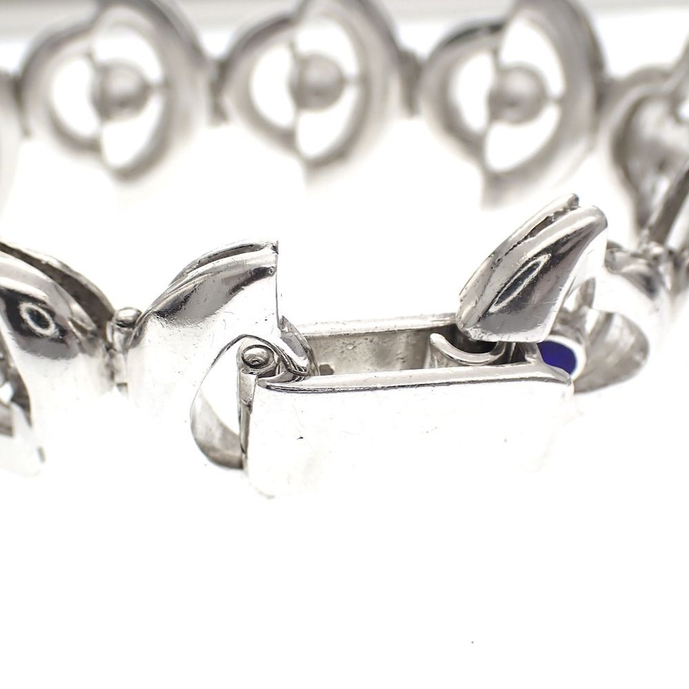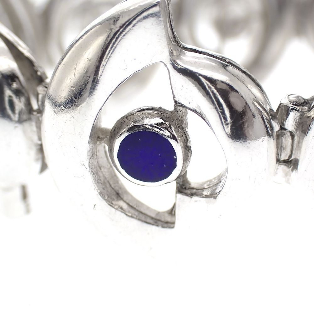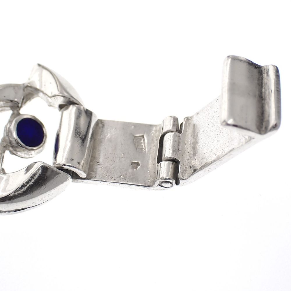 A unique and robust silver bracelet. Each link is designed as an eyelet with a royal blue enamel center. The bracelet is made of 800/1000 silver.