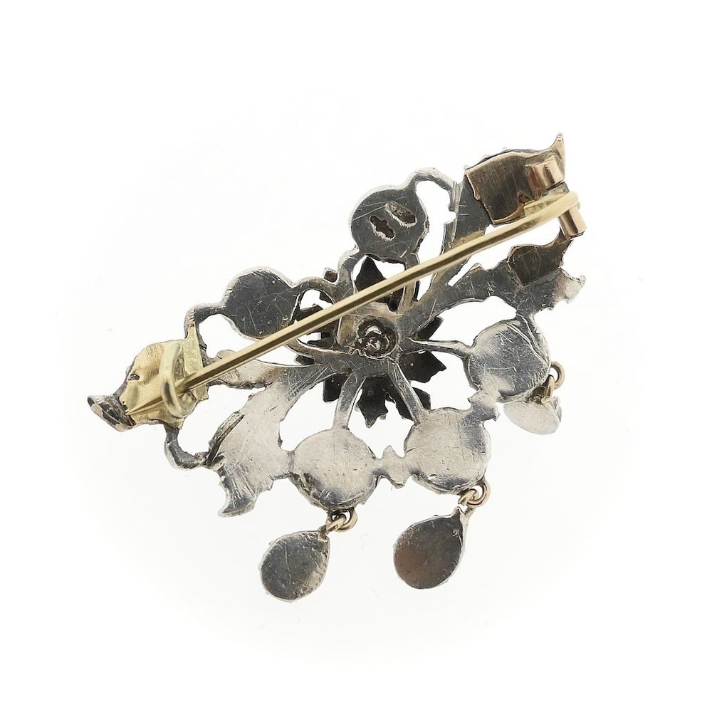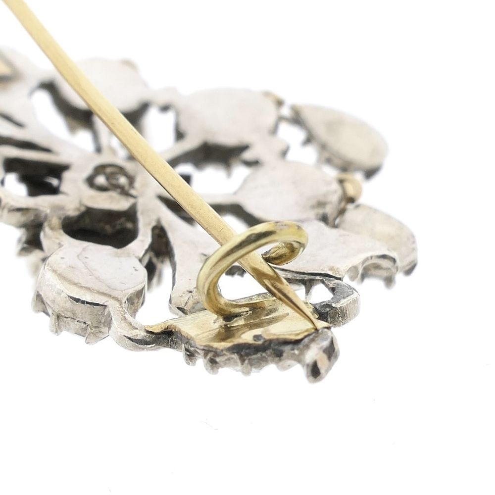Antique silver brooch set with a total of 1.60 ct. natural rose-cut diamonds. It is an antique brooch from the Victorian era. The brooch is set with 13 rose-cut diamonds. The brooch is handcrafted and features many intricate details. The diamonds are mounted on a piece of foil; it is important to minimize the contact with soap or water to preserve their beauty. This was often done in the past with diamond jewelry. The pin of the brooch is made of 14-karat yellow gold (585/1000) and the brooch itself is made of second-grade silver (835/1000).