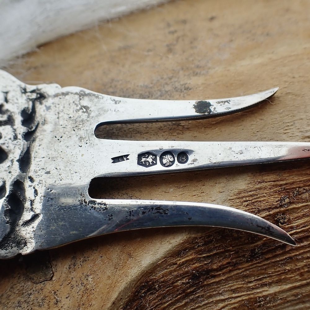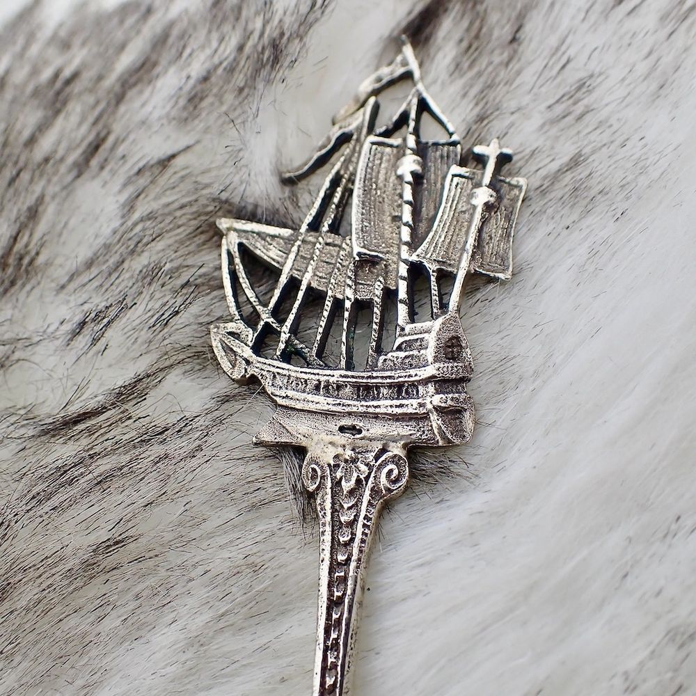 A beautifully detailed silver cake skewer. The skewer features a sailing ship on the handle, while the fork is decorated with a festive scene. The fork is stamped with the 1936 year mark and is made of 835/1000 silver. Country of origin: Netherlands, 1936