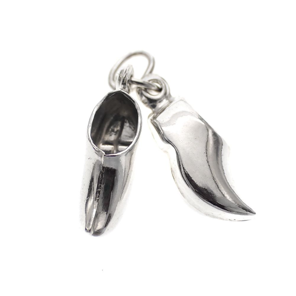 Silver pendant depicting a pair of clogs. The pendant is made of first-grade silver (925/1000) and is hallmarked with the Dutch hallmark.