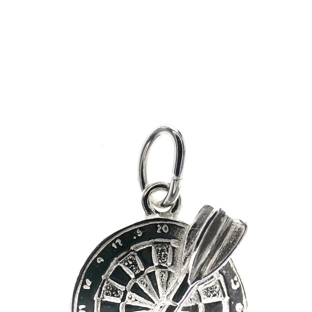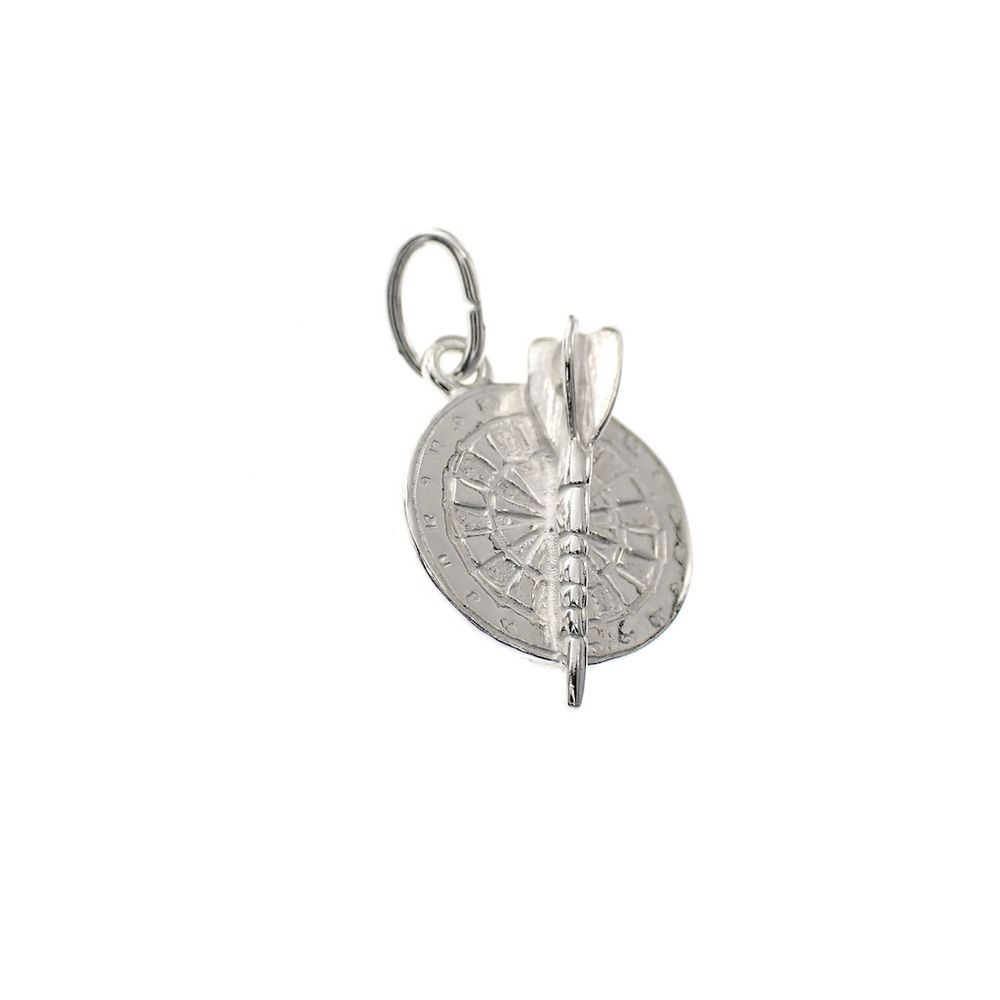 Silver charm of a dartboard with arrow
