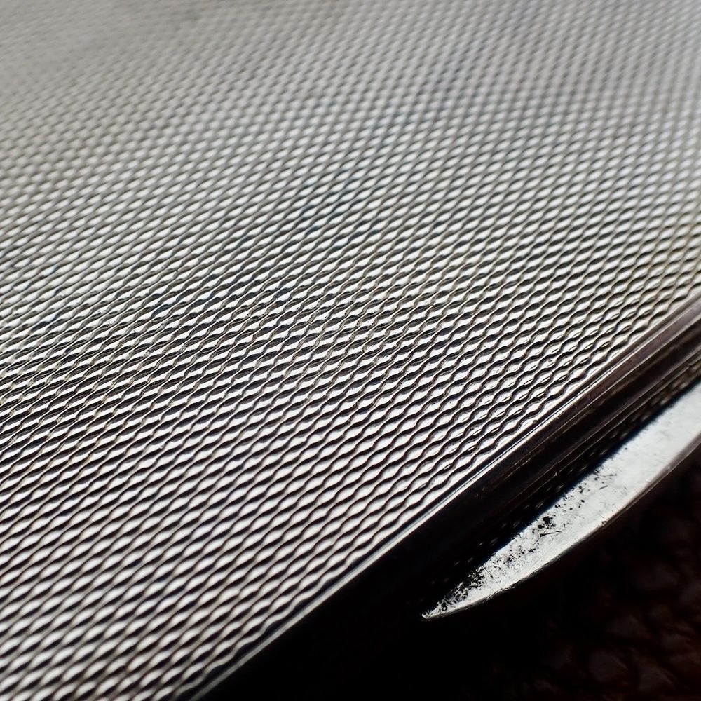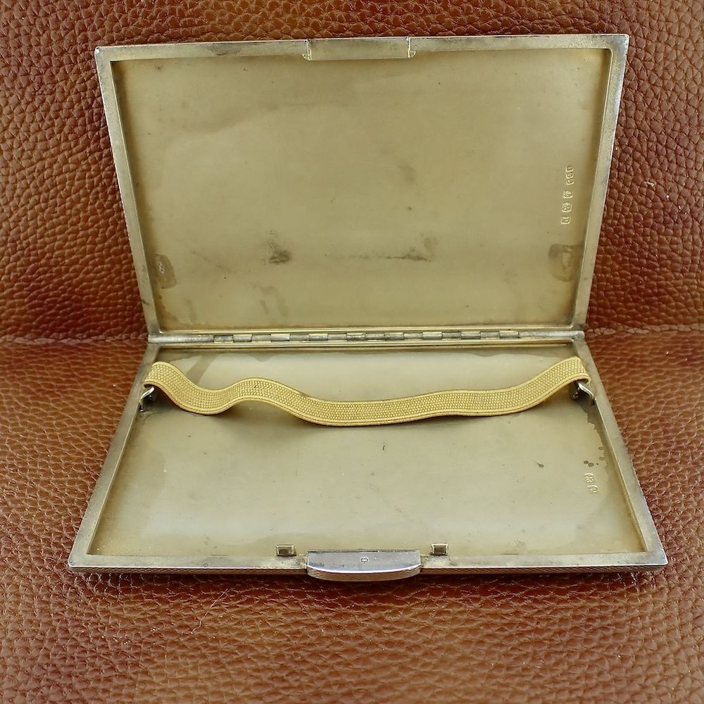Silver cigarette case. The inside of the case is lightly gilded to prevent silver from reacting chemically. Weighing 220.21 grams, the cigarette case is a solid silver case. The case is made of 925/1000 sterling silver. The case is stamped with English Birmingham hallmarks and the 1939 date stamp.