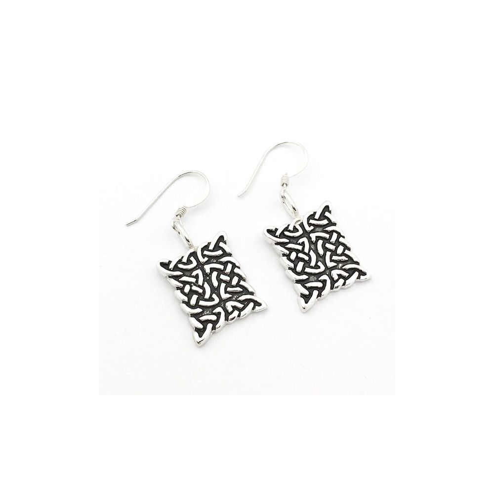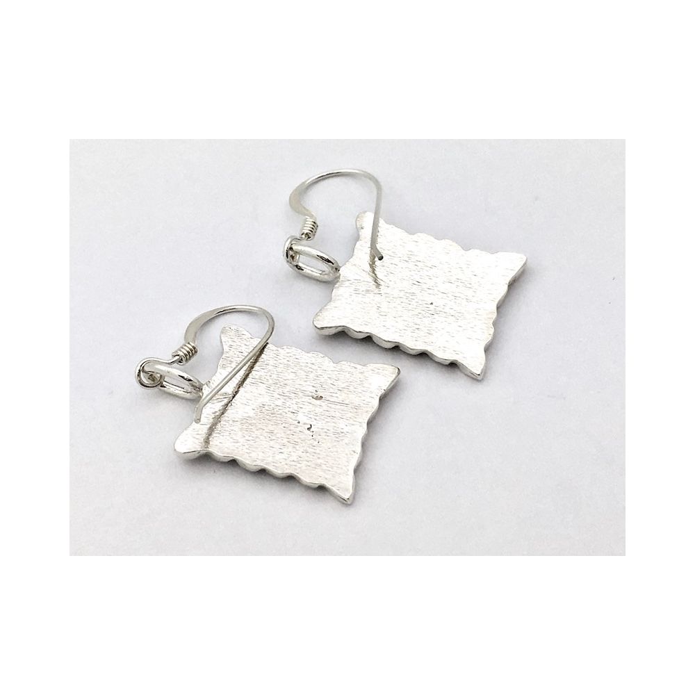 Silver earrings with a fantasy image. The earrings are rectangular, measuring 15.4 x 18.7 mm. The total height of the earrings is 38.6 mm.