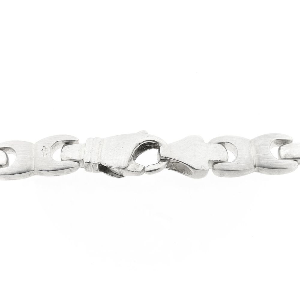 Silver fantasy link chain. The chain has a robust appearance and the links are partially matted. The back has a smooth finish. The chain features a lobster clasp and is made of premium silver (925/1000).